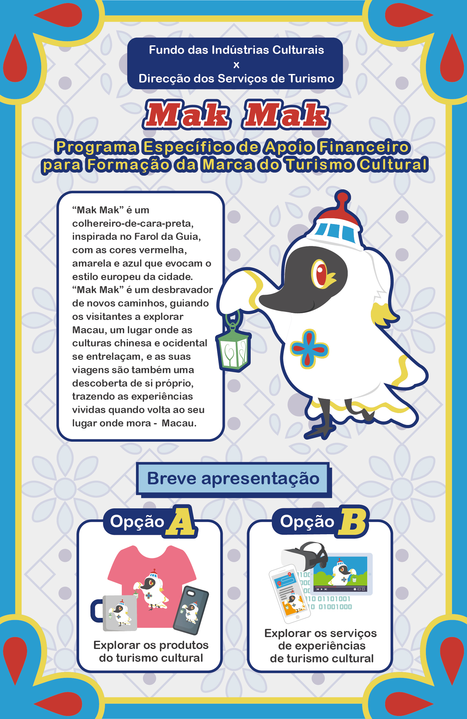 Em sintonia com o objectivo de transformar Macau num centro mundial de turismo e lazer, é necessário aumentar a diversidade dos produtos e serviços de experiências turísticas. A fim de encorajar as empresas culturais e criativas de Macau a explorar os elementos culturais de Macau e a desenvolver novos produtos e serviços de experiências culturais, em colaboração com a Direcção dos Serviços de Turismo (DST) , o Fundo das Indústrias Culturais (FIC) lança o “Programa Específico de Apoio Financeiro para a Formação da Marca do Turismo Cultural --- Mak Mak” (doravante “programa”). O projecto candidato deve conter elementos do turismo de cultura de Macau, correspondendo ao conceito de design da mascote “Mak Mak”, seguindo o fim de promover o turismo de Macau com a mascote de turismo, para lançar produtos do turismo cultural, ou explorar serviços de experiências de turismo cultural de Macau.