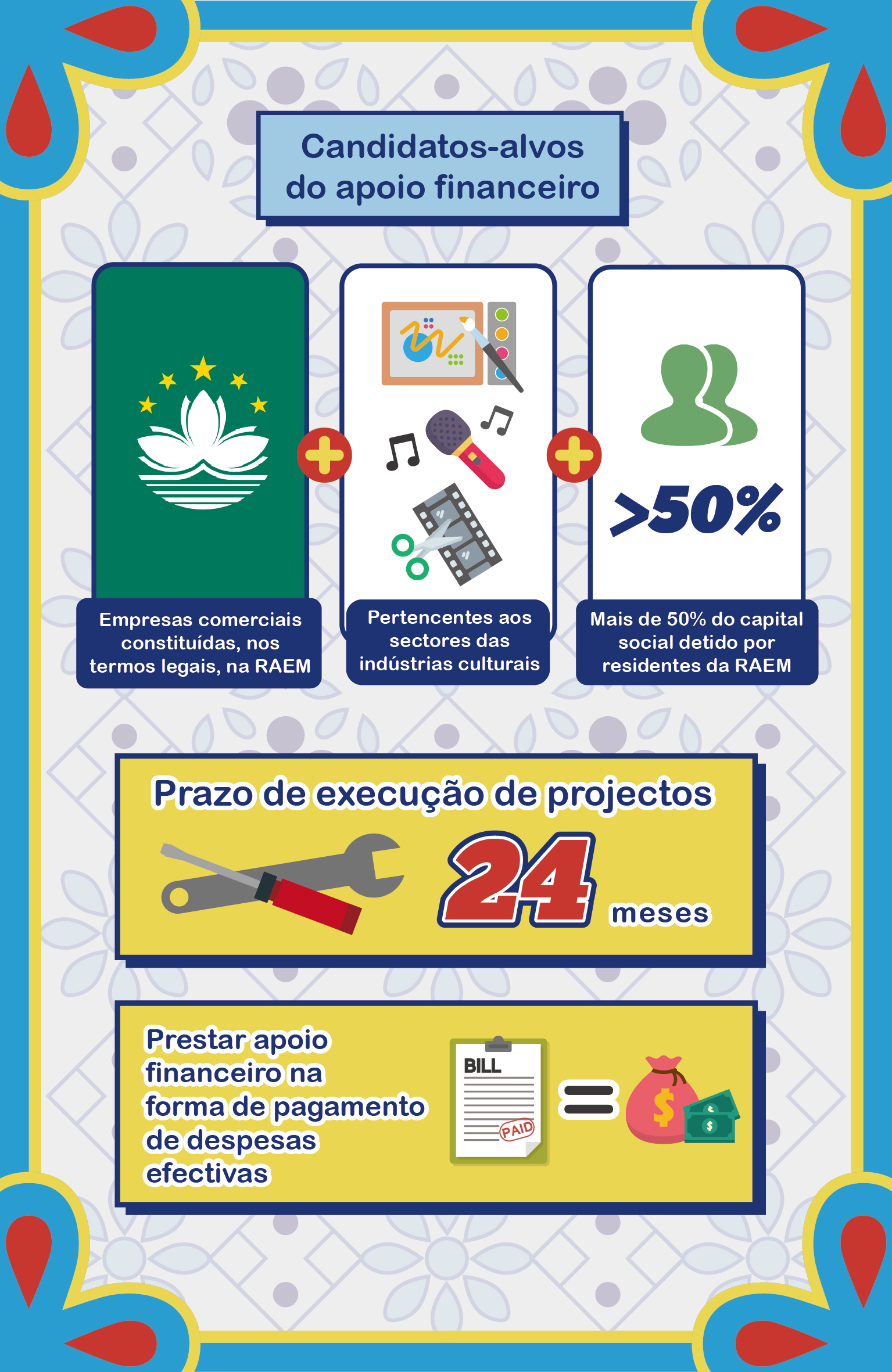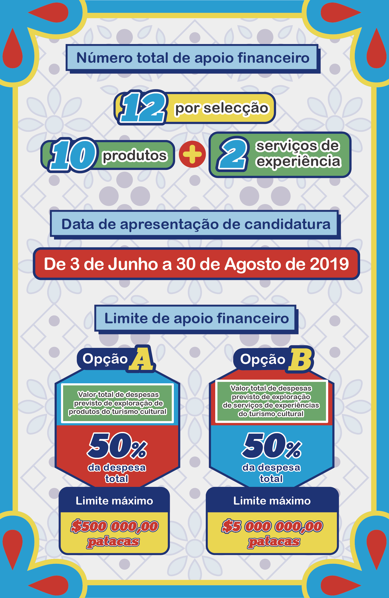 O limite de apoio financeiro é 50% da despesa total prevista do projecto, com o limite máximo de $500,000.00 patacas para “explorar os produtos do turismo cultural”, e, o limite máximo de $5,000,000.00 patacas para “explorar os serviços de experiências de turismo cultural”. O FIC irá prestar apoio financeiro na forma de pagamento de despesas efectivas, devendo as verbas de apoio financeiro ser geridas através de conta bancária específica fechada, sujeitando-se à auditoria de companhia auditora, no sentido de assegurar que o erário público seja eficientemente aplicado.