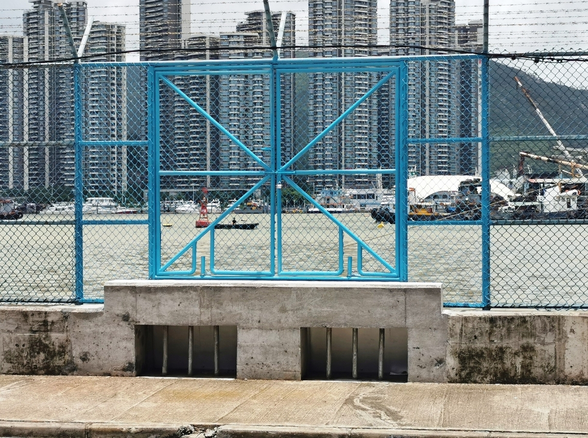 Por outro lado, a fim de evitar a obstrução da abertura da válvula pelo lixo de grandes dimensões, e ao mesmo tempo evitar a imigração ilegal, a abertura tem um gradeamento metálico. Cada conjunto de válvulas pesa aproximadamente 140 Kg, em caso de haver “Storm Surge” grave, a válvula mantém-se fechada pelo seu próprio peso e pela pressão da água do mar, em volta da abertura tem uma borda de borracha para reduzir a taxa de infiltração, impedindo efectivamente a entrada de água do mar no Porto Interior num curto espaço de tempo.