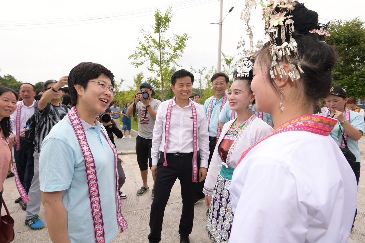 Na ida ao distrito de Congjiang, Sónia Chan, juntamente com os 50 alunos do ensino secundário de Macau, visitaram a “Segunda Escola Secundária de Minorias”, num evento de intercâmbio e confraternização com 50 dos estudantes locais. Tiveram oportunidade de conhecer as instalações, nomeadamente, o edifício principal e a sala de artes visuais, entre outros espaços. Seguidamente, Sónia Chan, Zhang Rongshun, os jovens de Macau e da “Segunda Escola Secundária de Minorias”, participaram num, evento de danças e cantares tradicionais “Cai Getang” do grupo étnico Dong.