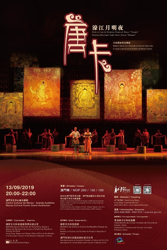 A fim de celebrar o Festival da Lua, Noite de Luar de Haojiang – Drama de Dança “Thangka”, integrada na série de actividades do evento “Arte Macau”, terá lugar no dia 13 de Setembro, pelas 20:00 horas, no Grande Auditório do Centro Cultural de Macau. O espectáculo é organizado pelo Gabinete para os Assuntos de Hong Kong, Macau e Taiwan do Ministério da Cultura e Turismo da República Popular da China e pelo Instituto Cultural do Governo da Região Administrativa Especial de Macau, com o apoio do Ministério da Cultura e Turismo da República Popular da China e da Secretaria para os Assuntos Sociais e Cultura do Governo da Região Administrativa Especial de Macau, e ainda co-organizado pelo Departamento de Cultura e Turismo de Qinghai e apresentado pelo Grupo Teatral e Artístico Qinghai. Os bilhetes encontram-se à venda a partir de 1 de Agosto na Bilheteira Online de Macau.