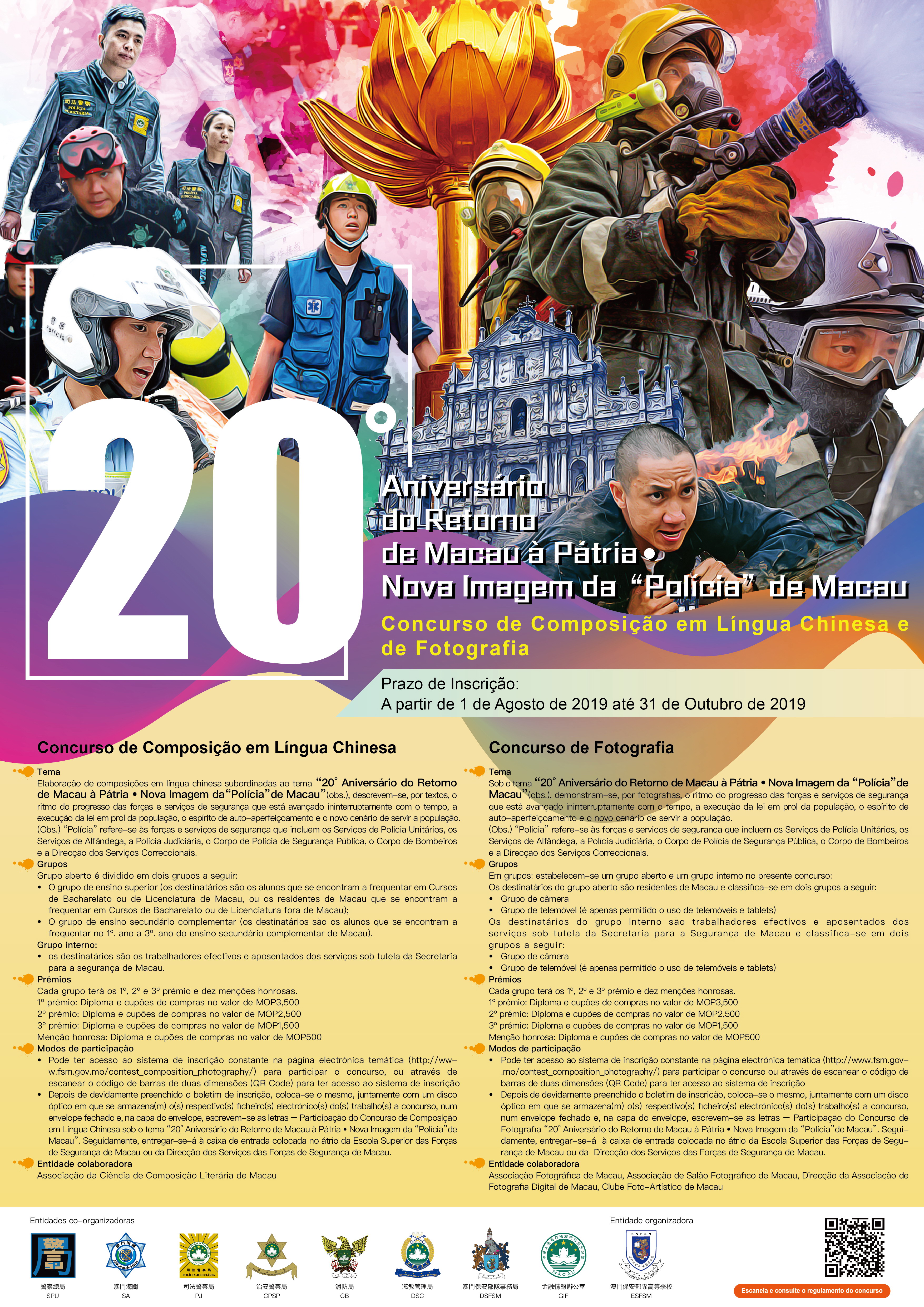 Com vista à celebração do 20° Aniversário do Retorno de Macau à Pátria, à promoção da construção da cultura policial e ao estabelecimento da imagem moderna das forças de segurança, as forças e serviços de segurança continuam a organizar conjuntamente, no corrente ano, um concurso de composição em língua chinesa e um concurso de fotografia, ambos subordinados ao tema “20° Aniversário do Retorno de Macau à Pátria Nova Imagem da “Polícia” de Macau”, que visam demonstrar o novo estilo positivo e de popularidade que tem sido desenvolvido pelas forças e serviços de segurança desde o retorno de Macau à Pátria. As inscrições para os concursos terão início a partir de 1 de Agosto de 2019 até 31 de Outubro de 2019, sendo bem-vinda a participação de todos os cidadãos.