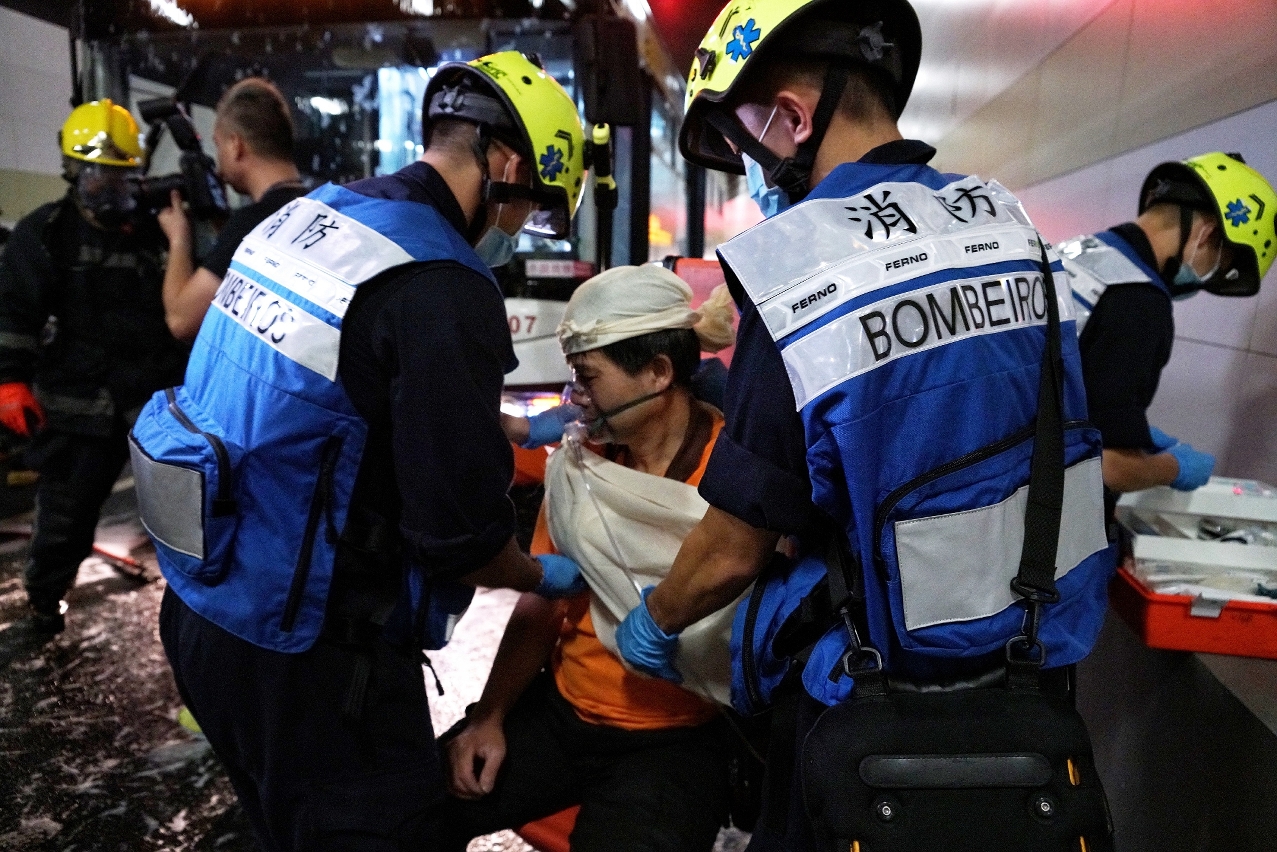Depois de receber o alarme, o CB, de acordo com o respectivo plano de emergência, enviou imediatamente viaturas para o local. Antes de os bombeiros chegarem, os funcionários da empresa gestora do túnel subaquático e o responsável das obras retiraram os objectos nas duas vias da faixa temporariamente encerrada, para que as viaturas do CB possam entrar no túnel. Ao chegaram no local, os bombeiros realizaram de imediato operações de combate a incêndios e de resgate. O condutor que foi removido da cabine do veículo ligeiro por bombeiros e o condutor ferido de autocarro foram transportados ao hospital.