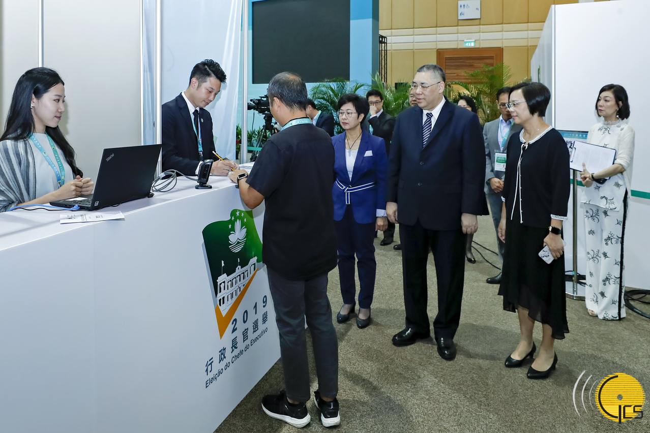 Chui Sain On, acompanhado pela secretária para a Administração e Justiça, Sónia Chan, assistiu à apresentação da presidente da CAECE, Song Man Lei, sobre o novo sistema de reconhecimento facial, que identifica os membros que entram na assembleia de voto, bem como, outros procedimentos do acto eleitoral.