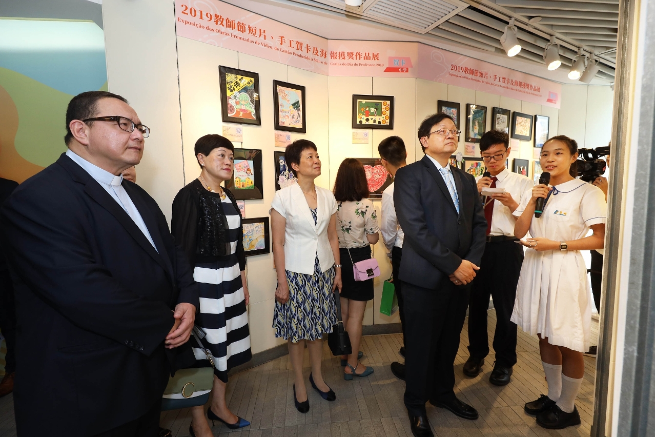 Além disso, os convidados atribuíram um certificado aos vencedores do Concurso de Design de Vídeo, de Cartão Produzido à Mão e de Cartaz do Dia do Professor 2019, bem como entregaram os diplomas de agradecimento às escolas participantes. Um total de 197 alunos dos ensinos primário e secundário, oriundos de 31 escolas, foram premiados, com um total de 19 vídeos, 46 cartões produzidos à mão e 66 cartazes. Os alunos premiados conduziram a visita dos convidados, contribuindo para uma atmosfera calorosa.