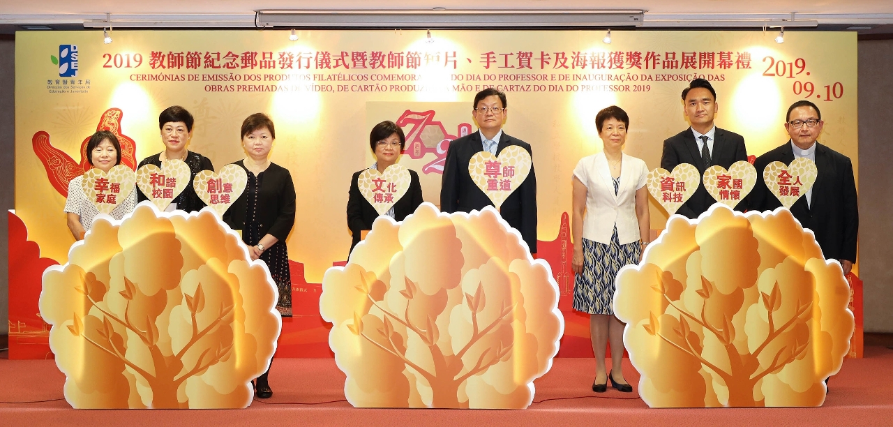 A Direcção dos Serviços de Educação e Juventude (DSEJ) e a Direcção dos Serviços de Correios e Telecomunicações colaboraram, continuamente, este ano, na emissão de produtos filatélicos comemorativos do Dia do Professor, tendo organizado, ainda, um Concurso de Design de Vídeo, de Cartão Produzido à Mão e de Cartaz do Dia do Professor, como iniciativa importante para celebrar este dia. Assim, na manhã do dia 10 de Setembro realizou-se, no Salão de Conferências Confúcio da DSEJ, a Cerimónia de Emissão dos Produtos Filatélicos Comemorativos 2019 e, depois, na Galeria Zizhan do Centro de Recursos Educativos (CRE), a Cerimónia de Inauguração da Exposição das Obras Premiadas de Design de Vídeo, de Cartão Produzido à Mão e de Cartaz do Dia do Professor 2019. As cerimónias contaram com a presença de Lou Pak Sang, director da DSEJ, Lau Wai Meng, directora da Direcção dos Serviços de Correios e Telecomunicações, Xu Ting, chefe do Departamento de Educação e Assuntos de Juventude do Gabinete de Ligação do Governo Popular Central na RAEM, Leong Vai Kei e Kong Chi Meng, subdirectores da DSEJ, Chong Seng Sam, membro do Conselho Administrativo do Fundo de Desenvolvimento Educativo e subdirectora dos Serviços de Finanças, Chan Hong, presidente da Associação de Educação de Macau, Chow Pak Fai, presidente da Associação das Escolas Católicas de Macau, Hoi Sok Cheng, presidente do Conselho Fiscal da Associação Educativa da Função Pública de Macau, membros do Conselho de Educação para o Ensino Não Superior, do Conselho de Juventude, do Conselho Profissional do Pessoal Docente e do Grupo Coordenador e Consultivo dos Trabalhos dos Cursos de Formação do Pessoal Docente, Professores Distintos do ano escolar de 2017/2018 e representantes das escolas, entre outros.