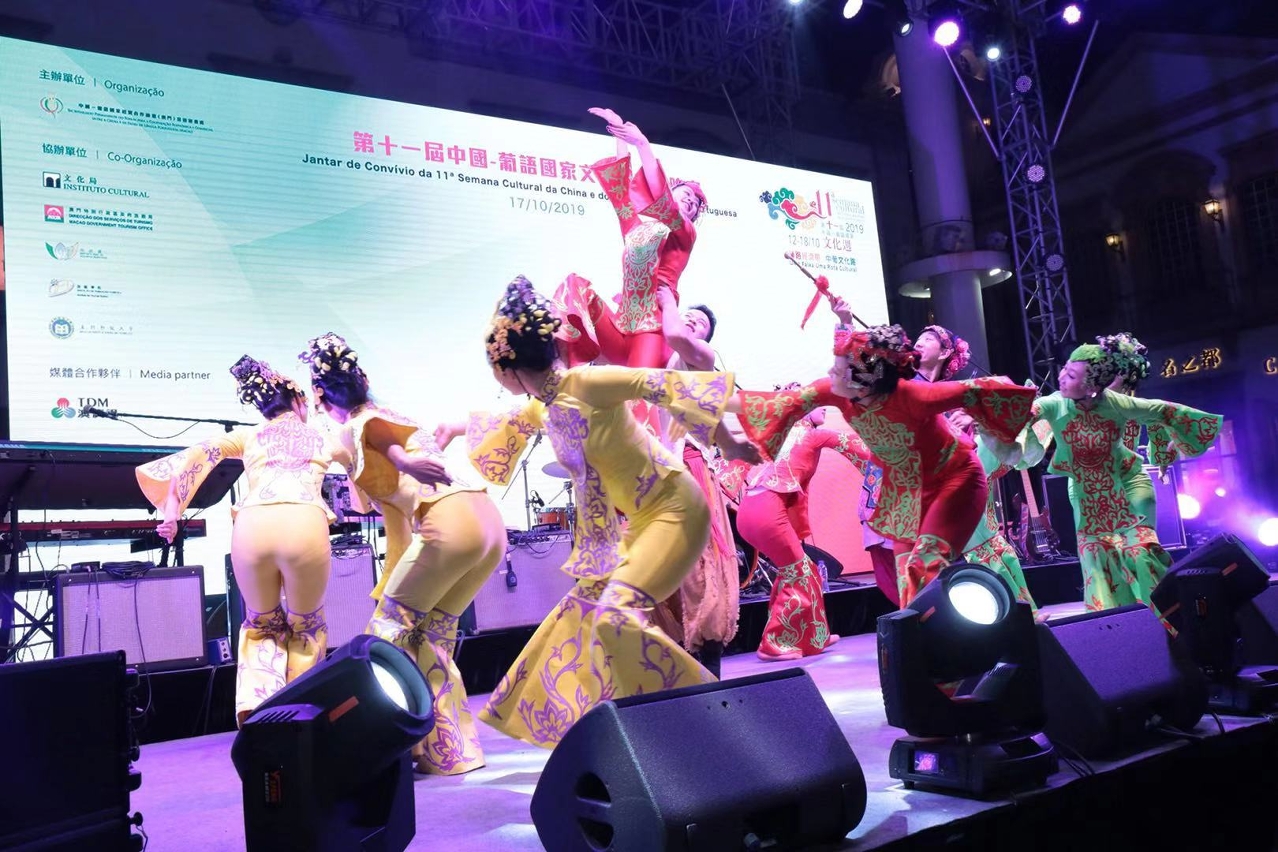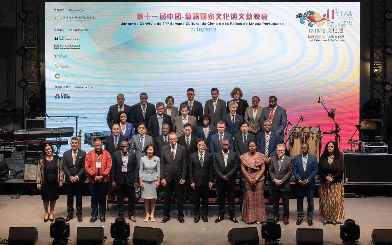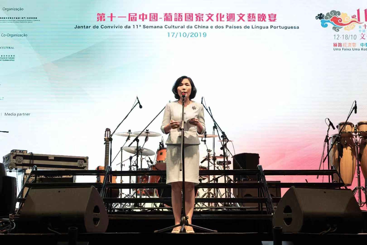 O Serão de Espectáculos da 11.ª Semana Cultural da China e dos Países de Língua Portuguesa teve lugar no dia 17 de Outubro na Praça Rossio da Doca dos Pescadores. A cerimónia de celebração contou com a presença da Secretária-Geral do Secretariado Permanente do Fórum de Macau, Dra. Xu Yingzhen, do Ministro da Indústria, Comércio e Energia de Cabo Verde, Eng. Alexandre Dias Monteiro, da Ministra da Educação de Cabo Verde, Dra. Maritza Rosabal Peña, do Secretário-Geral do Gabinete de Ligação do Governo Popular Central na RAEM, Dr. Wang Xindong, do Embaixador de Angola na China, Dr. João Salvador dos Santos Neto, do Embaixador da Guiné-Bissau na China, Eng. Malam Sambu, da Embaixadora de São Tomé e Príncipe na China, Dra. Isabel Maya Jesus da Graça Domingos, do Embaixador de Timor-Leste na China, Dr. Bendito Freitas, do Cônsul-Geral do Brasil em Macau e Hong Kong, Dr. Piragibe dos Santos Tarrago, do Cônsul-Geral de Portugal em Macau e Hong Kong, Dr. Paulo Cunha Alves e do Ministro Polenipotenciário da Embaixada de Moçambique na China, Dr. António Rodrigues José, entre outros. Para além destes convidados, estiveram presentes neste jantar os representantes das entidades co-organizadoras da Semana Cultural, os grupos artísticos participantes provenientes da China e dos Países de Língua Portuguesa, representantes do sector industrial e comercial, e também representantes de várias associações.