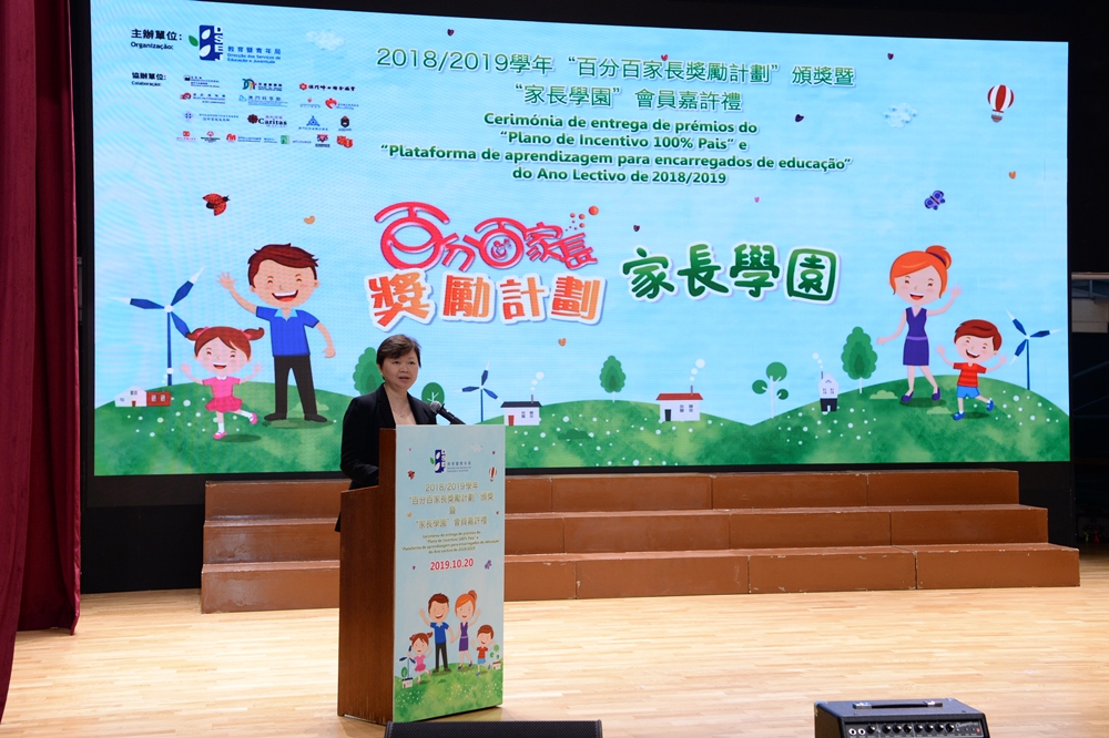 Para elogiar os encarregados de educação que participaram, no último ano, de forma entusiástica e positiva, nas actividades para a família e de educação parental, a DSEJ realizou a cerimónia de entrega de prémios do “Plano de Incentivo 100% Pais” e de louvores da “Plataforma de Aprendizagem para Encarregados de Educação” do ano lectivo de 2018/2019, bem como a cerimónia de lançamento do “Plano de Incentivo 100% Pais” do ano lectivo de 2019/2020, no dia 20 de Outubro, pelas 10h30, no auditório da Escola Luso-Chinesa Técnico-Profissional. As cerimónias contaram com a presença de vários convidados, nomeadamente, a Directora substituta da DSEJ, Leong Vai Kei, o Chefe do Departamento de Ensino, Kong Ngai, a Curadora do Museu das Comunicações da Direcção dos Serviços de Correios e Telecomunicações, Wong Kam Ian, e o chefe do Departamento de Exibições e de Educação do Centro de Ciência de Macau, Leong Si Chong, além de mais 60 representantes de instituições educativas e associações.