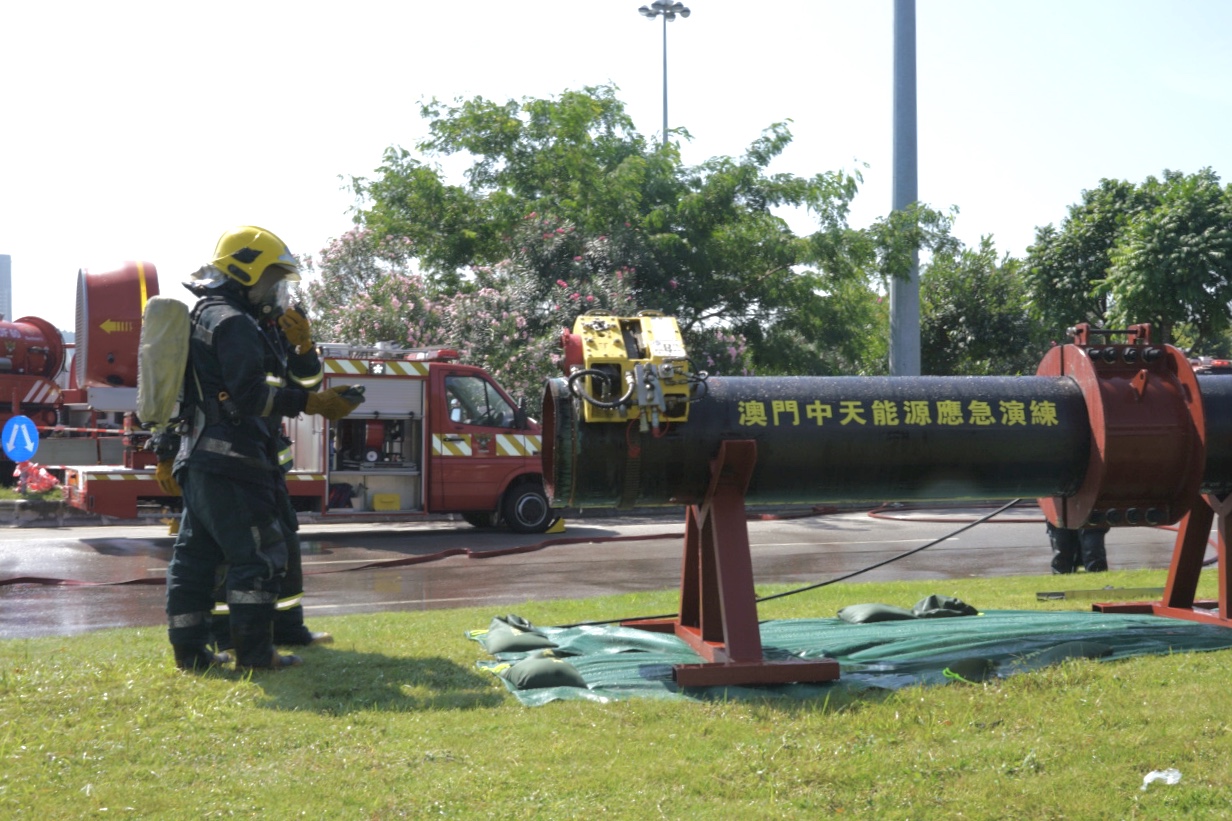 O exercício simulou a ruptura da conduta provocada pela execução de obras de terceiros em uma conduta subterrânea em alta pressão entre a sala de válvula e o gate da empresa Sinosky da Rotunda Marginal, causando assim uma grande quantidade de fuga do gás natural dentro da conduta e um incêndio, 1 trabalhador de execução de obras ficou ferido. Ao mesmo tempo, o pessoal da Companhia de Gestão de Participações e Energia Sinosky, Limitada activou imediatamente os planos de emergência e ligou ao CB para pedir o auxílio. Após a recepção da chamada, esta Corporação enviou veículos de emergência e pessoal para acorrerem ao local, depois da chegada dos bombeiros, desenvolveram logo as tarefas de combate a incêndios e socorro, simultaneamente, os socorristas procederam à enfermagem preliminar junto do ferido e transportaram-no para o hospital.