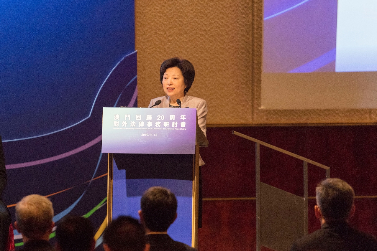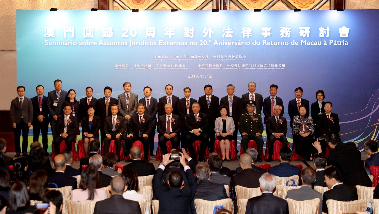 Realizou-se, no dia 12 de Novembro de 2019, o “Seminário e Exposição Fotográfica sobre Assuntos Jurídicos Externos no 20.º Aniversário do Retorno de Macau à Pátria”, organizado pelo Ministério dos Negócios Estrangeiros (MNE) da República Popular da China e Governo da Região Administrativa Especial de Macau (RAEM) e realizado pela Secretaria para a Administração e Justiça e Departamento de Tratados e Leis do MNE, com a colaboração e apoio do Comissariado do MNE na RAEM. O Chefe do Executivo, Chui Sai On, o Vice-Presidente do Comité Nacional da Conferência Consultiva Política do Povo Chinês, Edmund Ho, a Comissária do MNE na RAEM, Shen Beili, o Subdirector do Gabinete de Ligação do Governo Popular Central na RAEM, Luo Yonggang, o Vice-Comandante da Guarnição em Macau do Exército de Libertação do Povo Chinês, Liu Yunjun, o Presidente da Assembleia Legislativa, Kou Hoi In, o Presidente do Tribunal de Última Instância, Sam Hou Fai e os titulares dos principais cargos do Governo da RAEM participaram na cerimónia de inauguração. Mais de 400 representantes da Comissão da Lei Básica da RAEM junto do Comité Permanente da Assembleia Popular Nacional da China, do MNE, do Gabinete para os Assuntos de Hong Kong e Macau do Conselho de Estado, dos Gabinetes de Ligação do Governo Popular Central em Hong Kong e em Macau, dos Comissariados do MNE em Hong Kong e em Macau e dos serviços públicos da RAEM e da Região Administrativa Especial de Hong Kong (RAEHK), especialistas e académicos, representantes de associações e estudantes participaram no Seminário e Exposição Fotográfica.