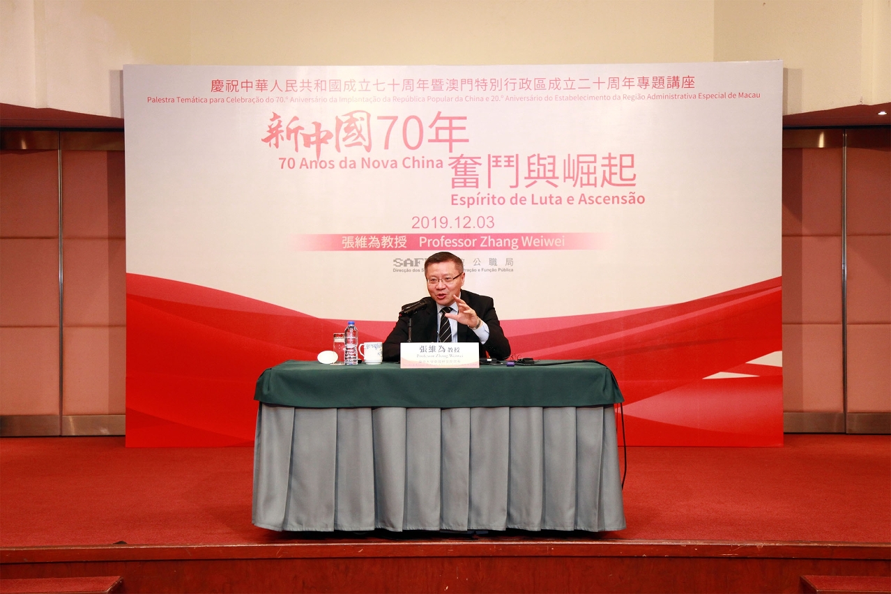 Para comemorar o 70.º aniversário da Implantação da República Popular da China e o 20.º aniversário da Região Administrativa Especial de Macau, os SAFP organizaram a palestra temática sobre os “70 anos da Nova China: Espírito de Luta e Ascensão”, tendo sido convidado o Professor Zhang Weiwei, Director do Instituto de Investigação Chinesa da Universidade de Fudan, de renome do Interior da China, para proferir a palestra.