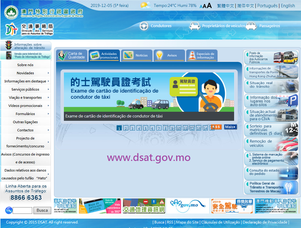 De forma a corresponder às expectativas tecnológicas e necessidades ambientais, a prova utilizada para atribuição do estatuto de condutor de táxi, até agora em formato papel, passará a assumir, de forma permanente, formato tecnológico a partir do próximo ano. Informam-se os candidatos que a primeira prova será no próximo dia 15 de Janeiro de 2020, na sala de prova sita na Avenida da Praia Grande, Edifício China Plaza, 3.º andar.