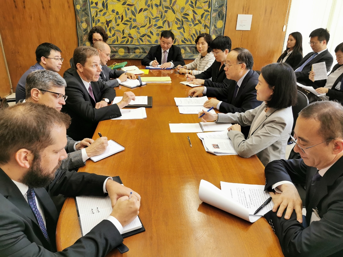 O Vice-Ministro relembrou que este ano marca o 45.º aniversário do reatamento das relações diplomáticas entre a China e o Brasil. Enalteceu que actualmente as relações sino-brasileiras se encontram no seu auge histórico, destacadas pelo aumento contínuo do seu impacto global e estratégico. O Vice-Ministro apontou que a China é hoje o maior parceiro comercial do Brasil, e que as cooperações nas áreas do investimento e da infraestrutura têm vindo a ser desenvolvidas. Fez ainda uma apresentação sobre o Fórum de Macau, bem como as iniciativas a propor pela parte chinesa na organização da 6.ª Conferência Ministerial do Fórum de Macau. O Vice-Ministro solicitou os bons ofícios e a cooperação da parte brasileira nos trabalhos preparatórios da 6.ª Conferência Ministerial e na comunicação efectiva sobre os conteúdos do “Plano de Acção para a Cooperação Económica e Comercial”, documento-resultado desta Conferência, procurando evidenciar mais resultados na cooperação sino-brasileira no quadro do Fórum de Macau.