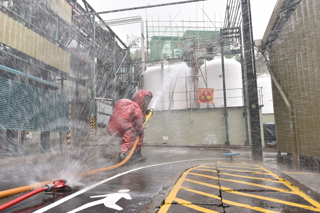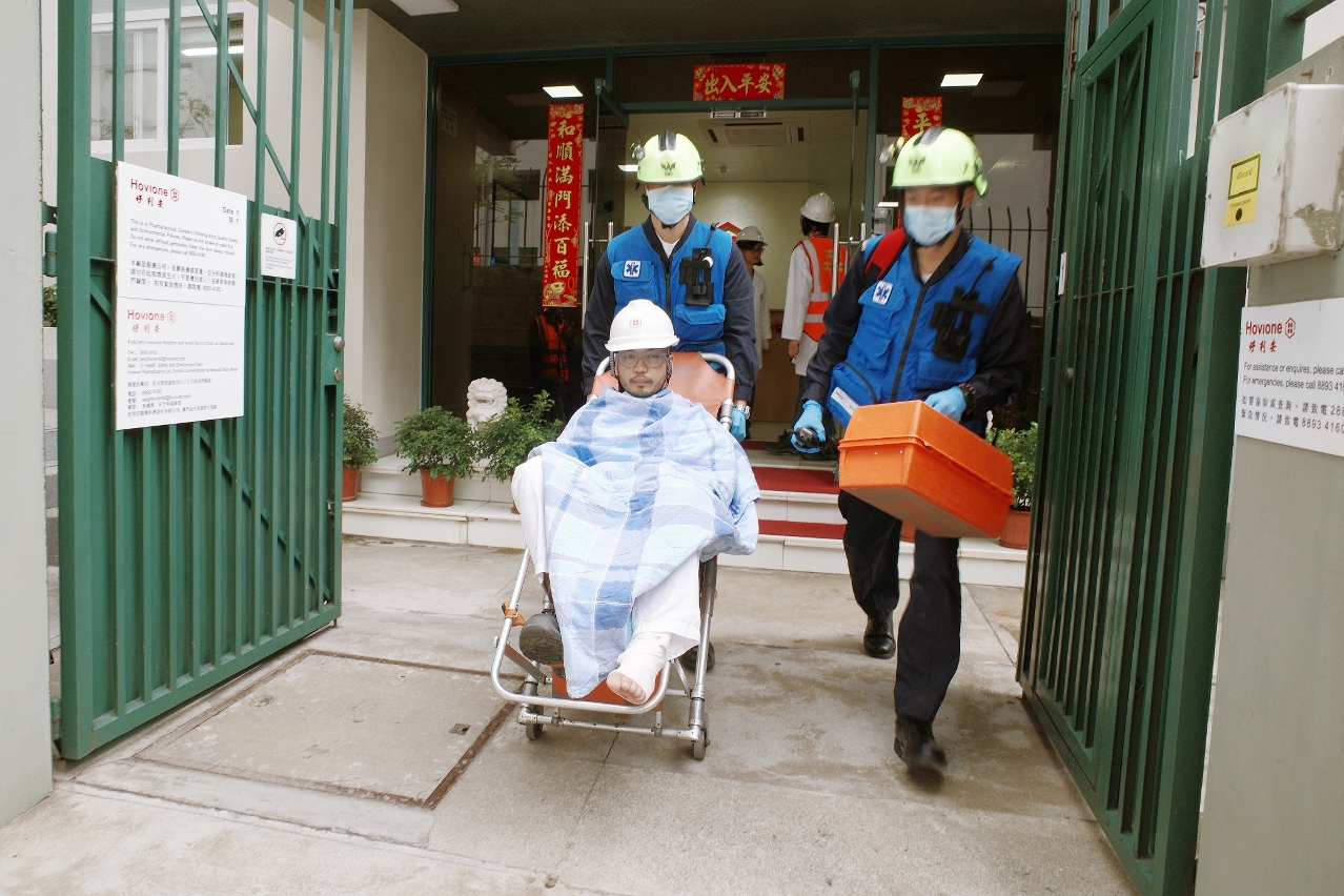 O exercício simulou que os trabalhadores descobriram que havia fuga na conduta de transporte de solventes entre 2 tanques de armazenamento e um incêndio foi provocado pela electricidade estática. A equipa de emergência e contingência da fábrica da Hovione efectuou imediatamente as acções internas de contingência, ao mesmo tempo, ligou ao CB para pedir ajuda e tomou as medidas de segurança, de modo a evacuar os empregados para o ponto de evacuação e encontro, durante a evacuação, havia 1 trabalhador que ficou ferido. Depois da recepção do incêndio ocorrido na fábrica da Hovione, o CB enviou logo 9 veículos de emergência e 38 bombeiros ao local, a fim de executar as acções de extinção do fogo, evacuação e busca conforme o plano definido, bem como proceder imediatamente à enfermagem imediata junto do ferido, cujo processo durou quase 1 hora.