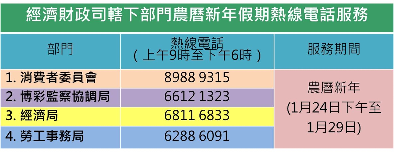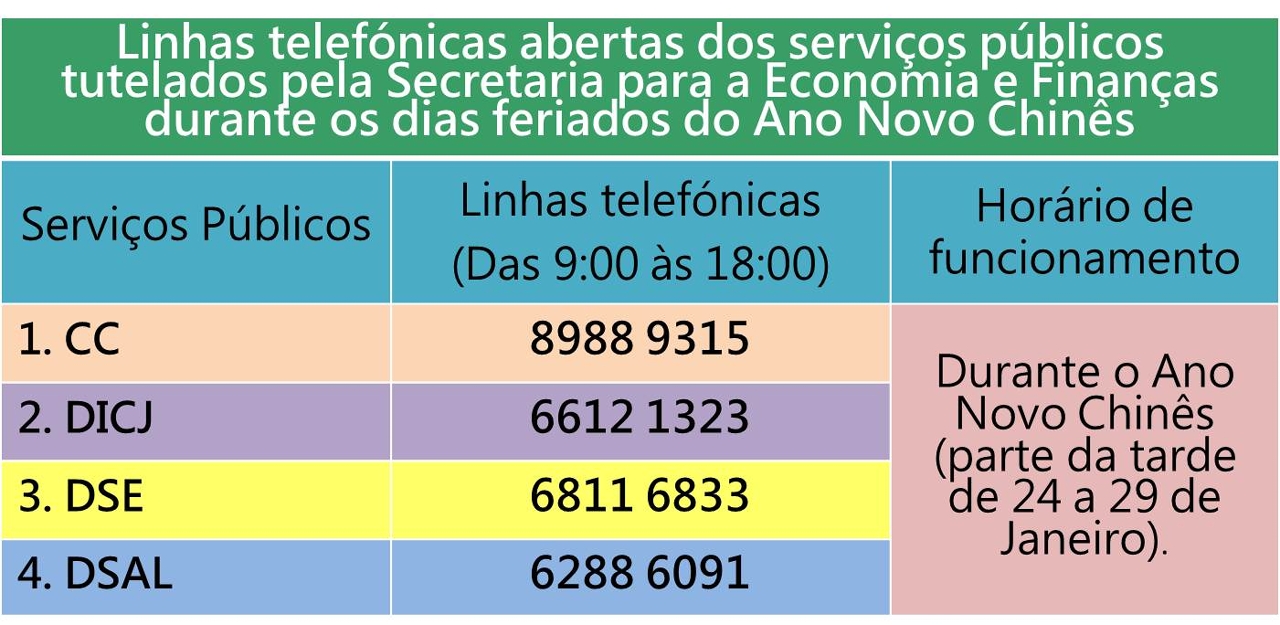 Durante os dias feriados do Ano Novo Chinês (parte da tarde de 24 a 29 de Janeiro), os quatro serviços públicos tutelados pela Secretaria para a Economia e Finanças, designadamente o Conselho dos Consumidores (CC), a Direcção de Inspecção e Coordenação de Jogos (DICJ), a Direcção dos Serviços de Economia (DSE) e a Direcção dos Serviços para os Assuntos Laborais (DSAL), vão criar linhas telefónicas abertas para proporcionar aos residentes e visitantes apoios e serviços atempados, fazendo também votos de boas festas.