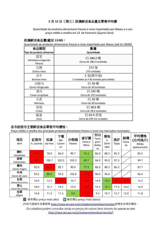 (Os cidadãos podem consultar ainda os preços de outros itens através do websitedo IAM: https://www.iam.gov.mo/p/onedaymarketvalue/menulist/)