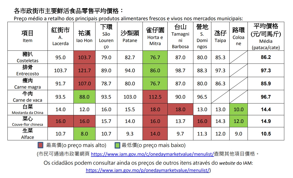 (Os cidadãos podem consultar ainda os preços de outros itens através do website do IAM: https://www.iam.gov.mo/p/onedaymarketvalue/menulist/)