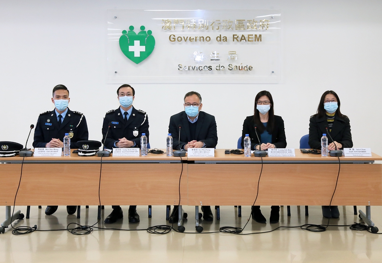 Estiveram presentes na conferência de imprensa, o médico adjunto da Direcção, Dr. Lei Wai Seng, a coordenador do Centro de Prevenção e Controlo da doença, Leong Iek Hou, a Chefe do Departamento de Licenciamento e Inspecção da Direcção dos Serviços de Turismo, Dr.ª Inês Chan e o Chefe da Divisão de Operações e Comunicações do Corpo de Polícia de Segurança Pública, Dr. Ma Chio Hong.