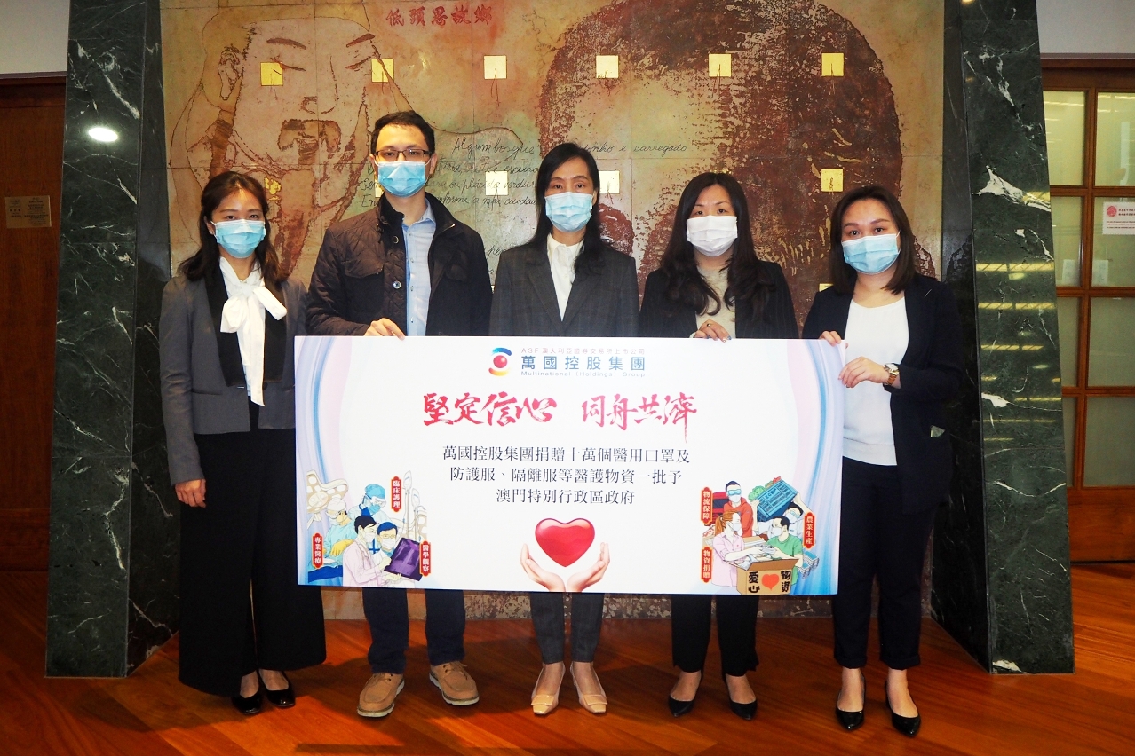 Em nome do Governo da RAEM, a Secretária para os Assuntos Sociais e Cultura, Ao Ieong U, agradeceu ao Presidente da empresa Multinational Holdings Group, Alex Lao, pela sua generosa doação de materiais anti-epidémicos, assim contribuindo para os trabalhos de combate à epidemia do novo coronavírus.