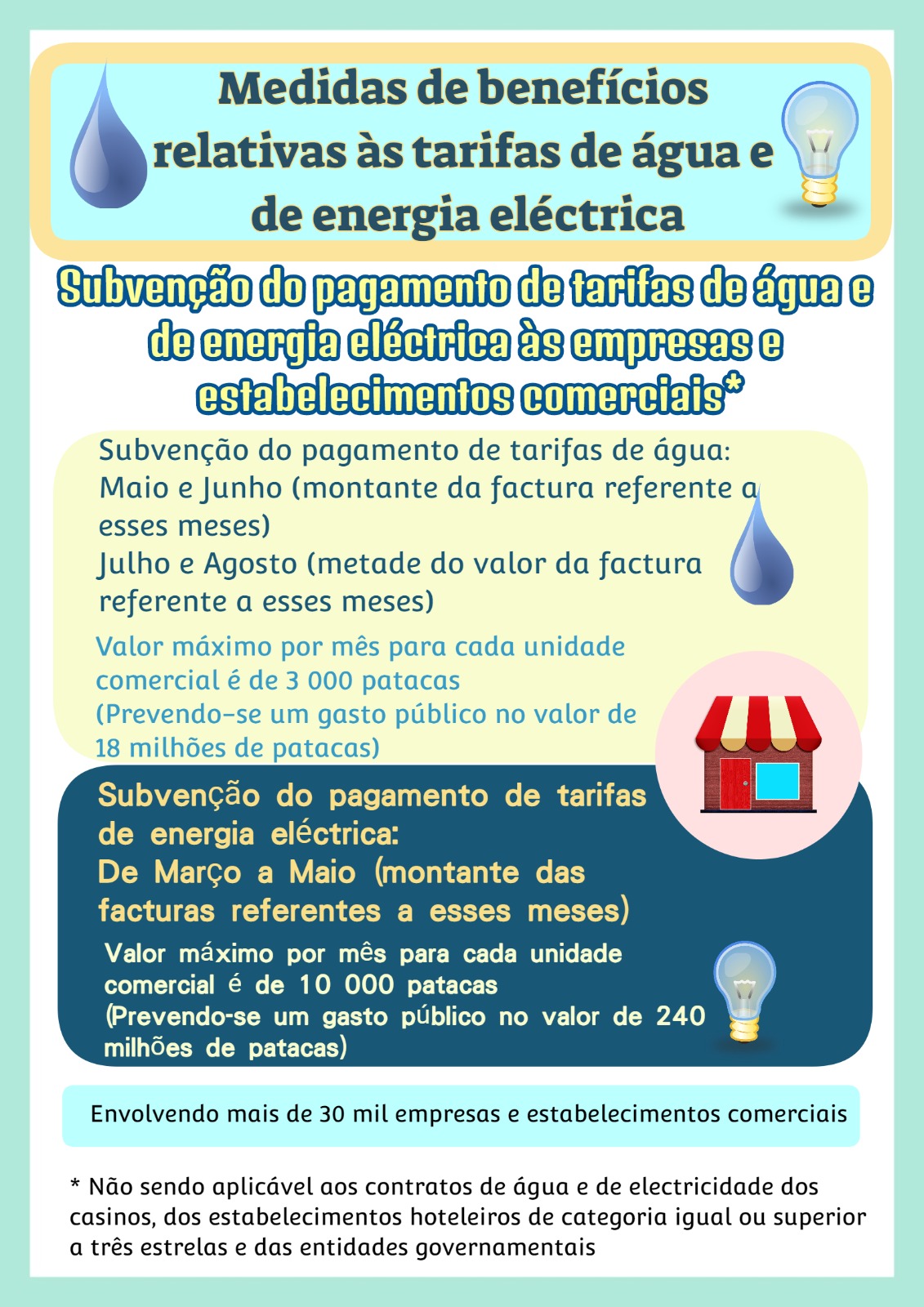 No intuito de prestar apoio aos utentes das unidades não habitacionais em que se operam diversos ramos de actividade, e atendendo a que o volume do consumo de água e de electricidade varia em todos os estabelecimentos comerciais, o Governo da RAEM vai lançar uma medida relativa à subvenção do pagamento das tarifas de água e de energia eléctrica dirigida às empresas e estabelecimentos comerciais, com uma duração de três meses, sendo o valor-limite a subsidiar mensalmente, para cada unidade comercial, de 3 000 patacas no que respeita às tarifas de água e 10 mil patacas no referente às tarifas de electricidade.
