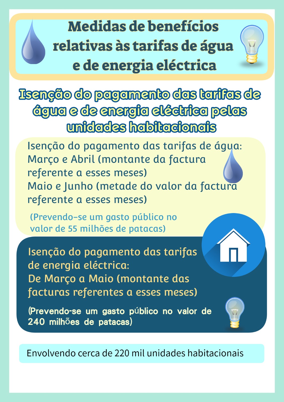 Tendo em conta a adesão dos residentes à medida de permanência em casa, promovida pelo Governo da RAEM para prevenir e combater a epidemia, e como forma de aliviar, de algum modo, os encargos financeiros resultantes do consumo de água e de electricidade durante essa permanência em casa, serão isentas as unidades habitacionais do pagamento das tarifas de água e de energia eléctrica por um período de três meses.