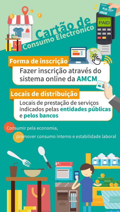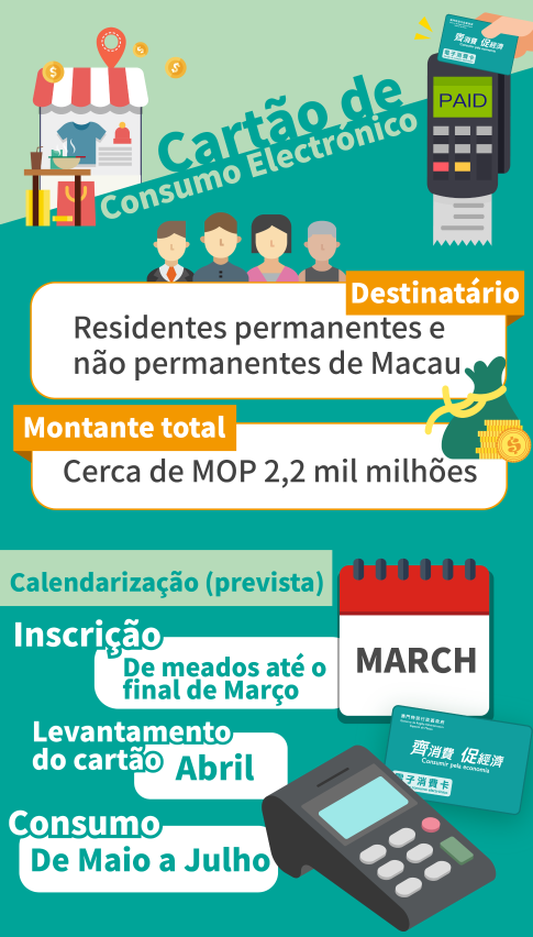 O Governo da RAEM vai atribuir a cada residente de Macau um cartão de consumo electrónico, com o valor nominal de 3 000 patacas, para ser usado dentro de um período de três meses, mediante a dedução do valor nele inserido, em restaurantes, recintos de venda a retalho, shopping centres e outros estabelecimentos, esperando-se que, através deste cartão, seja impulsionado o consumo local e dinamizada a procura.