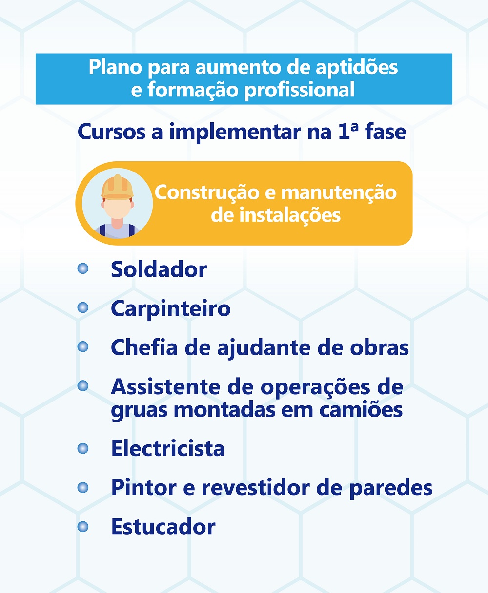 Na premissa do cumprimento rigoroso das actuais instruções sobre prevenção da epidemia, os sete cursos que nesta primeira fase possuem condições para serem implementados terão início no final de Março e compreendem os seguintes: soldador, carpinteiro, chefia de ajudante de obras, assistente de operações de gruas montadas em camiões, electricista, pintor e revestidor de paredes e estucador, sendo proporcionadas 300 vagas no total. Os cursos têm requisitos de admissão diferentes consoante as características de cada posto de trabalho e serão leccionados em regime presencial para ajudar os formandos a dominar as técnicas básicas, tendo a duração de cerca de um mês.