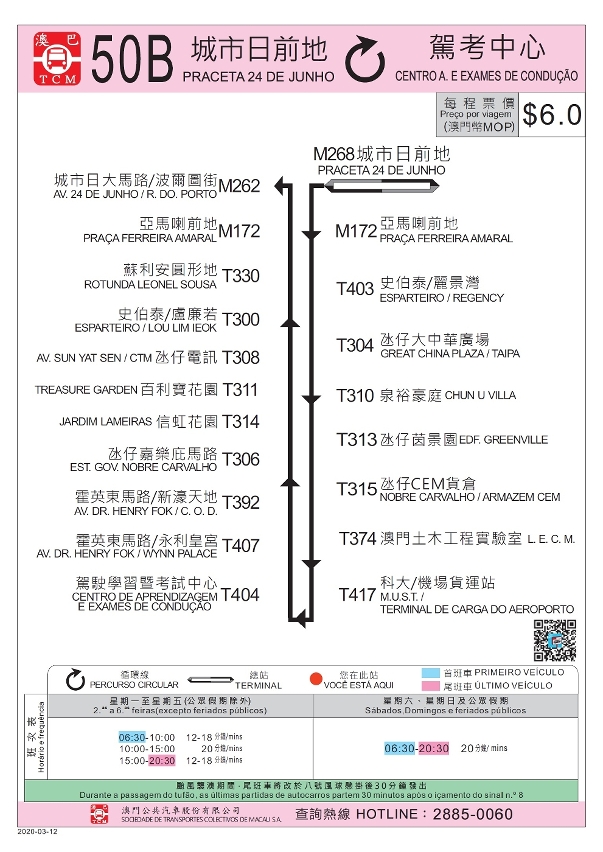 | 52 (para Avenida de Vale das Borboletas) Para Universidade de Macau︰71, 73 |