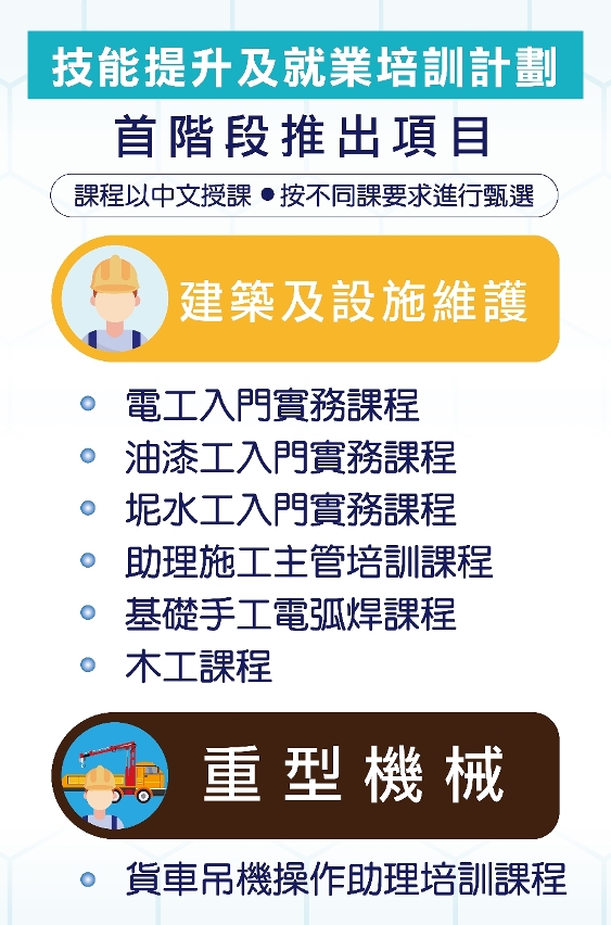 Alguns cursos são realizados em combinação com a obtenção de certificados, podendo os formandos, através de exame, obter os certificados de técnicas para elevarem as suas oportunidades de emprego. Durante os cursos, proceder-se-á de imediato ao respectivo trabalho de conjugação de emprego. Por outro lado, o Plano também contou com o apoio da Associação das Empresas Chinesas de Macau, sendo que as respectivas empresas chinesas de construção civil relevantes irão disponibilizar postos de trabalho correspondentes ao contéudo de formação, esperando que os formandos possam ter imediatamente o seu posto de trabalho após a conclusão do curso, permintindo assim uma ligação estreita entre a formação e o emprego e atingindo o objectivo de “auto-suficiência e não dependência”.