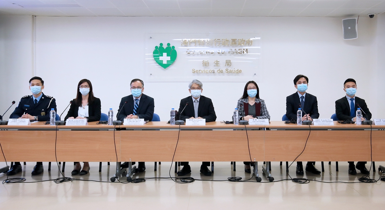 Estiveram presentes na conferência de imprensa o Director dos Serviços de Saúde, Lei Chin Ion, o médico adjunto da Direcção do CHCSJ, Dr. Lei Wai Seng, a chefe do Departamento de Licenciamento e Inspecção da Direcção dos Serviços de Turismo, Dra. Inês Chan, o chefe do Departamento de Estudos e Recursos Educativos da DSEJ, Wong Kin Mou, o Chefe do Departamento de Coordenação das Instituições do Ensino Superior, Teng Sio Hong, o Chefe da Divisão de Relações Públicas do Corpo de Polícia de Segurança Pública, Lei Tak Fai e a coordenadora do Centro de Prevenção e Controlo da doença, Dra. Leong Iek Hou.