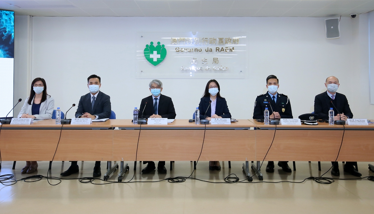 A conferência de imprensa contou com a presença do Director dos Serviços de Saúde, Dr. Lei Chin Ion, o Médico-Adjunto da Direcção do CHCSJ, Dr. Lo Iek Long, a Chefe do Departamento de Licenciamento e Inspecção da Direcção dos Serviços de Turismo, Dr.ª Inês Chan, o chefe da Divisão de Extensão Educativa destes Serviços, Dr. Wong Chi Iong, o Chefe da Divisão de Operações e Comunicações do Corpo de Polícia de Segurança Pública, Dr. Ma Chio Hong, a coordenador do Centro de Prevenção e Controlo da doença, Dr.ª Leong Iek Hou.