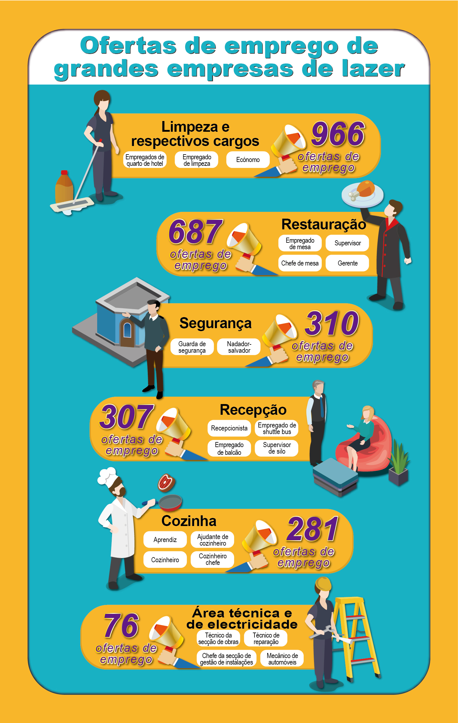 Empresas grandes de lazer de Macau ofereceram um total de 2 600 postos de trabalho, nomeadamente o de limpeza, empregados de mesa, recepcionista, segurança, cozinheiro, reparação em obras, etc…, sendo que, a DSAL está agora a contactar os trabalhadores com inscrição de pedido de emprego para fazer a respectiva conjugação, a fim de ajudar e estabilizar o emprego dos residentes.