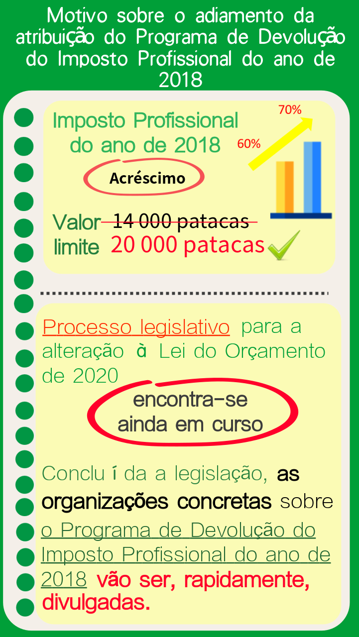 Tendo em consideração o impacto da pneumonia causada pelo novo tipo de coronavírus, o Governo da Região Administrativa Especial de Macau tem vindo a lançar várias medidas para aliviar as dificuldades da população, as quais incluem o acréscimo da percentagem e do respectivo valor limite da devolução da colecta do imposto profissional de 2018, passando de 60% inicial para 70%, até ao valor limite inicial de 14 000 para 20 000 patacas; visto que o processo legislativo para a alteração à Lei do Orçamento de 2020 se encontra ainda em curso, as organizações concretas sobre o Programa de Devolução do Imposto Profissional do ano de 2018 vão ser, rapidamente, divulgadas pela Direcção dos Serviços de Finanças, finda a legislação.