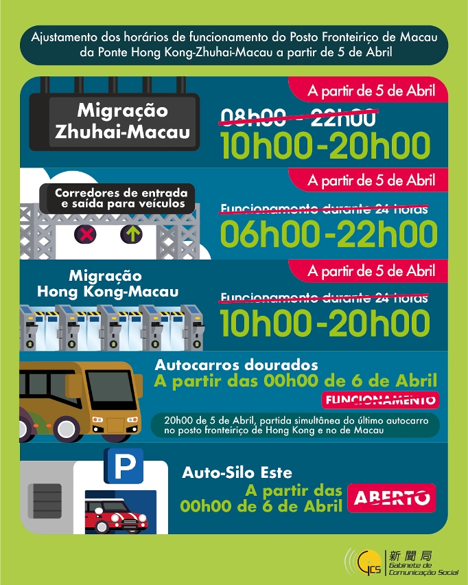 Infografia: Ajustamento dos horários de funcionamento do Posto Fronteiriço de Macau da Ponte Hong Kong-Zhuhai-Macau a partir de 5 de Abril