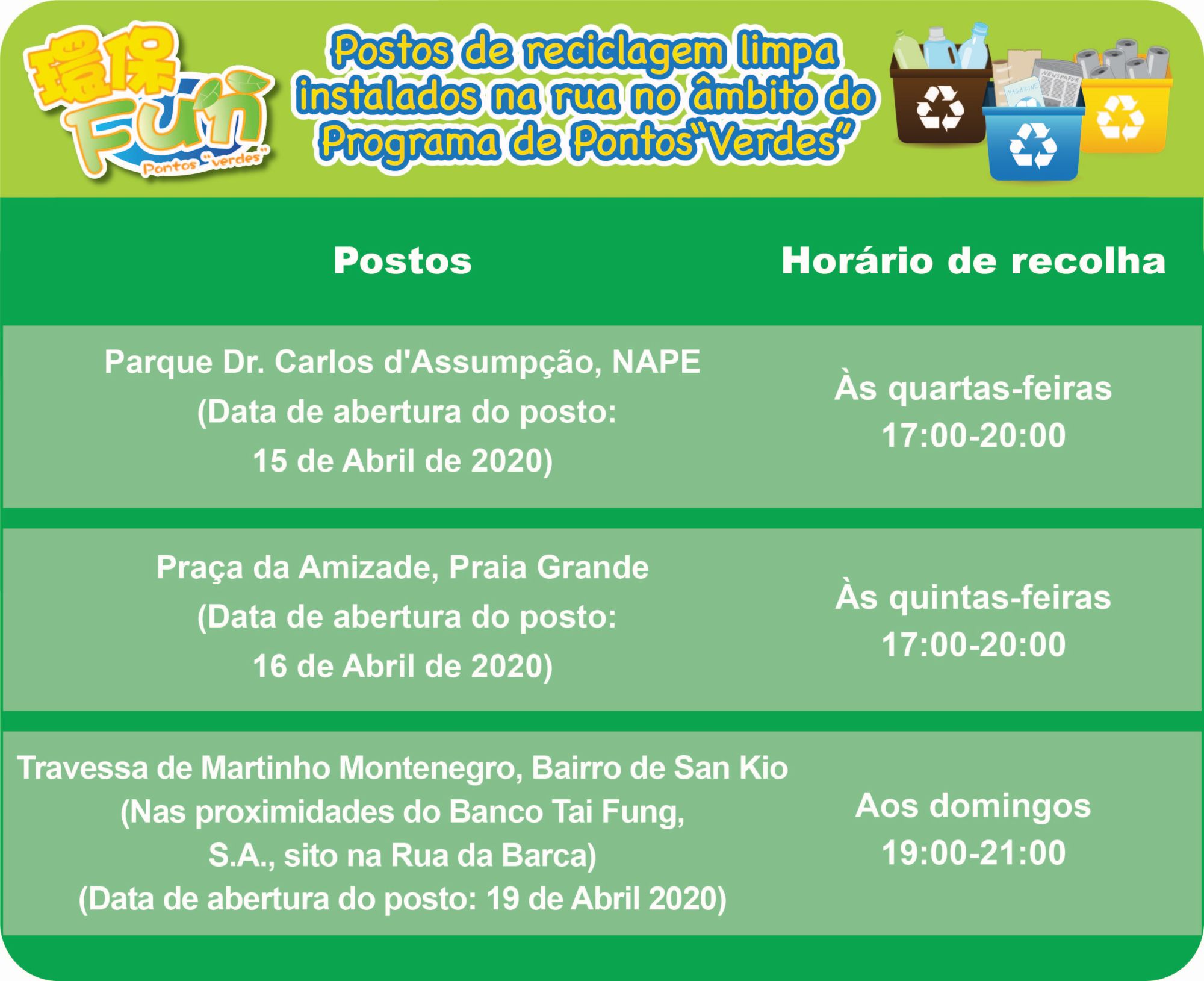 Com intuito de comemorar, no próximo dia 22 de Abril, o “Dia da Terra”, para divulgar a mensagem sobre a protecção ambiental, a Direcção dos Serviços de Protecção Ambiental (DSPA), em colaboração com as associações de protecção ambiental, procede a melhorias e optimização dos 19 postos de recolha do Programa de Pontos “Verdes” existentes. A partir de amanhã (dia 15), serão progressivamente instalados mais “postos de reciclagem limpa instalados na rua no âmbito do Programa de Pontos “Verdes””, nomeadamente no Parque Dr. Carlos d'Assumpção do NAPE, na Praça da Amizade da Praia Grande e na Travessa de Martinho Montenegro do Bairro de San Kio (nas proximidades do Banco Tai Fung, S.A., na Rua da Barca). Foi disponibilizado, ainda, o horário de recolha nocturno e durante os domingos, o que permite que aos “empregados” e cidadãos poder pôr em prática a reciclagem limpa após a sua saída do trabalho ou durante os feriados (é favor consultar o mapa anexo para mais pormenores).