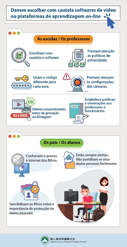 - Com o objectivo de garantir a segurança dos dados pessoais dos alunos ou dos seus pais, as escolas devem formular políticas e orientações de privacidade na utilização de softwares de vídeo e plataformas de aprendizagem on-line para os professores e funcionários as obedecerem e para os alunos e seus pais as tomarem conhecimento.