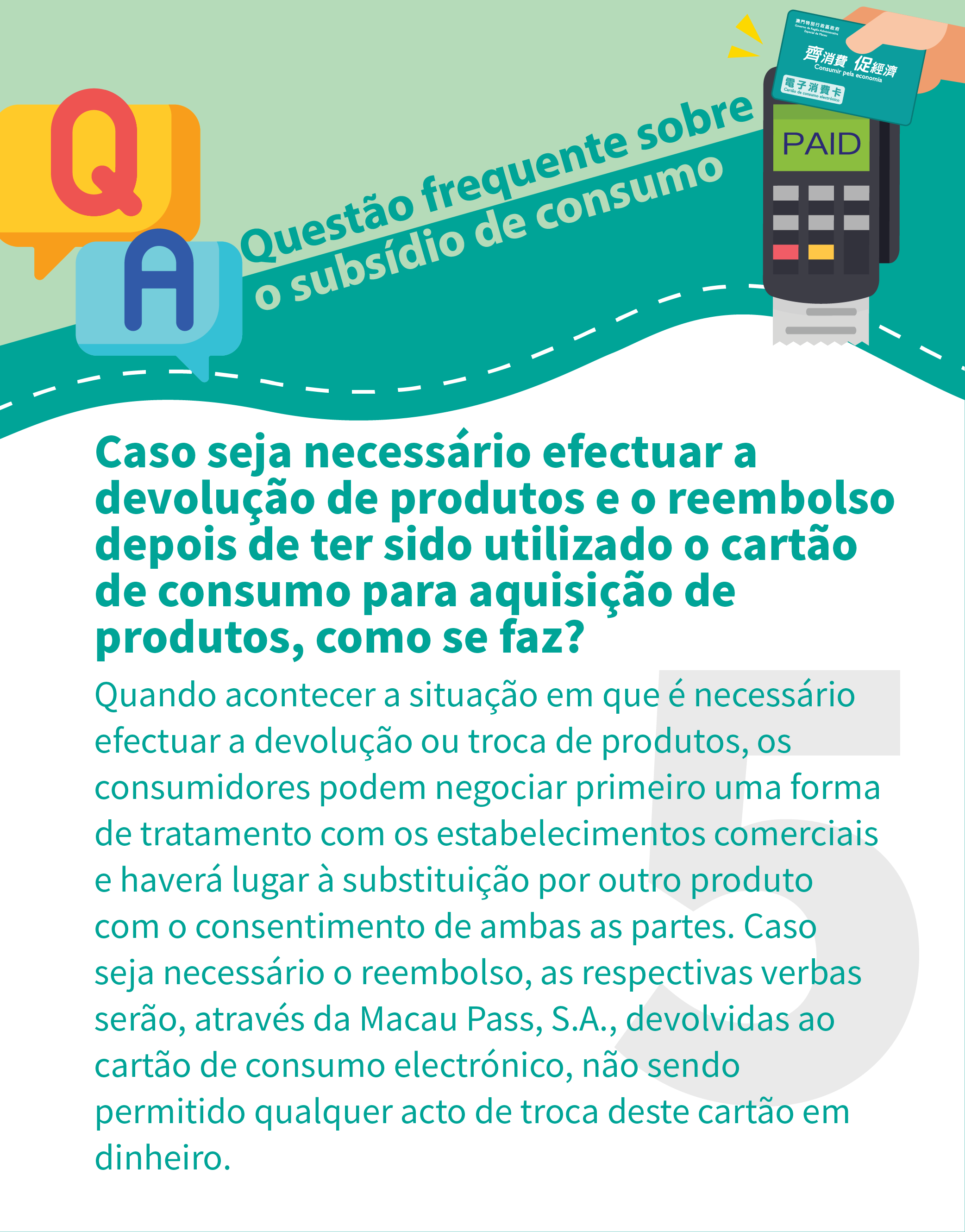 Quando acontecer a situação em que é necessário efectuar a devolução ou troca de produtos, os consumidores podem negociar primeiro uma forma de tratamento com os estabelecimentos comerciais e haverá lugar à substituição por outro produto com o consentimento de ambas as partes. Caso seja necessário o reembolso, as respectivas verbas serão, através da Macau Pass, S.A., devolvidas ao cartão de consumo electrónico, não sendo permitido qualquer acto de troca deste cartão em dinheiro.
