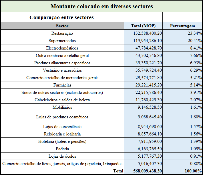 Ordenados conforme o número das transacções, no período entre os dias 1 e 10 de Maio, os primeiros cinco sectores são restauração, supermercados, produtos alimentares específicos, soma de outros sectores (incluindo autocarros) e outro comércio a retalho geral, representando, respectivamente, 28,59%, 22,41%, 8,72%, 7,86% e 5,46%.