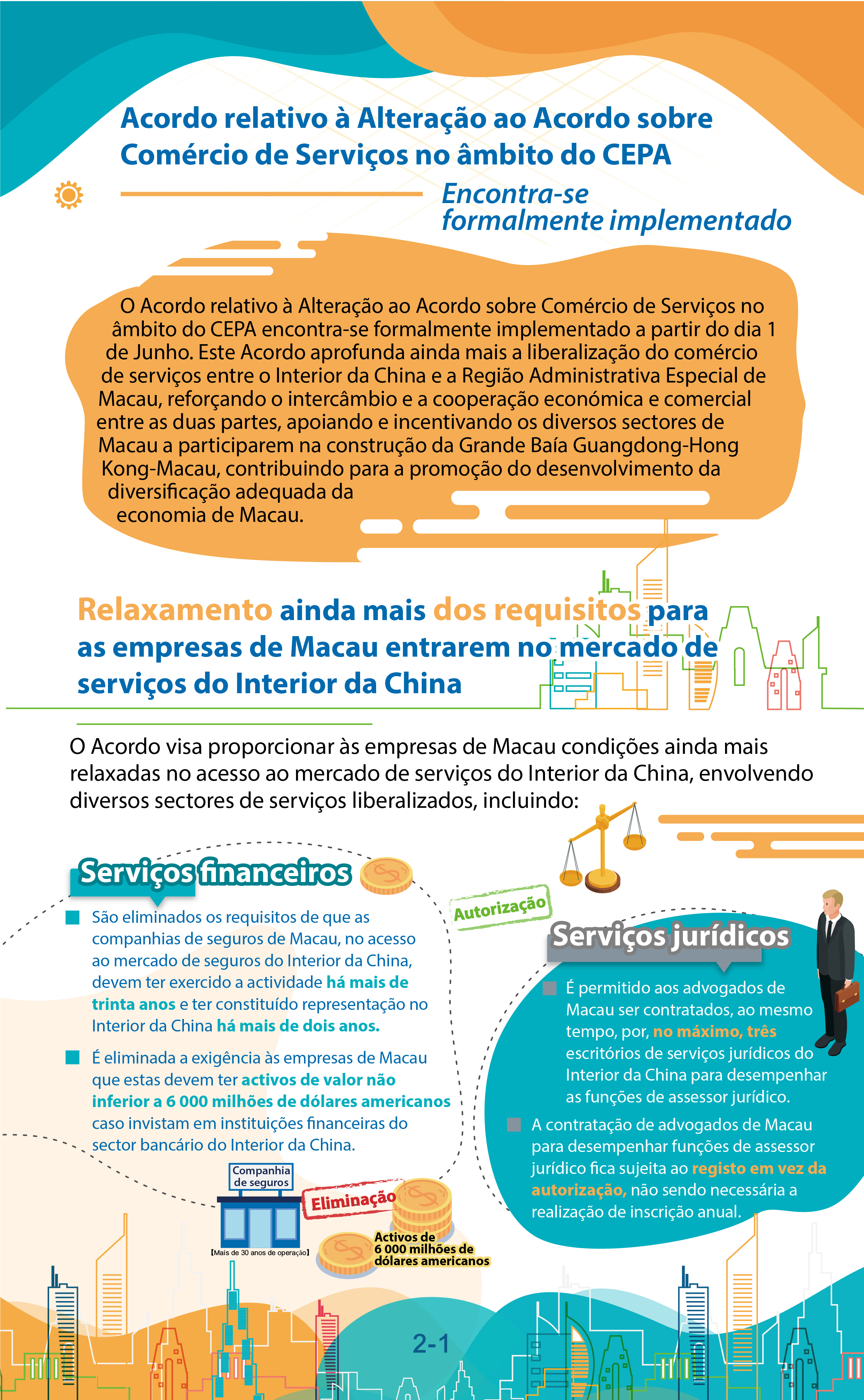 Desde a implementação do CEPA em 2004, o Interior da China e Macau têm constantemente ampliado e aprofundado a cooperação económica e comercial através de uma série de políticas e medidas no âmbito do CEPA. Para promover ainda mais a cooperação estreita no comércio de serviços entre as duas partes, elevar o nível de liberalização do sector de serviços e promover o desenvolvimento da diversificação adequada da economia de Macau, as duas partes assinaram, no dia 20 de Novembro de 2019, o Acordo relativo à Alteração ao Acordo sobre o Comércio de Serviços no âmbito do CEPA (adiante designado por Acordo), que começará a ser formalmente implementado amanhã (dia 1 de Junho).
