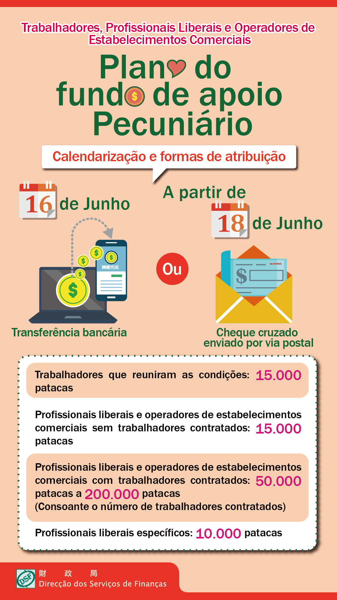 A Fundação Macau vai, no dia 16 de Junho de 2020, dar início à atribuição do apoio pecuniário através de transferência bancária. Quanto aos beneficiários que não tenham, ainda, procedido ao registo para receber o apoio pecuniário por transferência bancária, bem como aos profissionais liberais e aos operadores de estabelecimentos comerciais, que tenham trabalhadores contratados, o apoio pecuniário vai ser pago por meio de cheque cruzado a enviar por via postal, de modo faseado, a partir de 18 de Junho de 2020, de acordo com o endereço declarado na Direcção dos Serviços de Identificação ou na DSF.