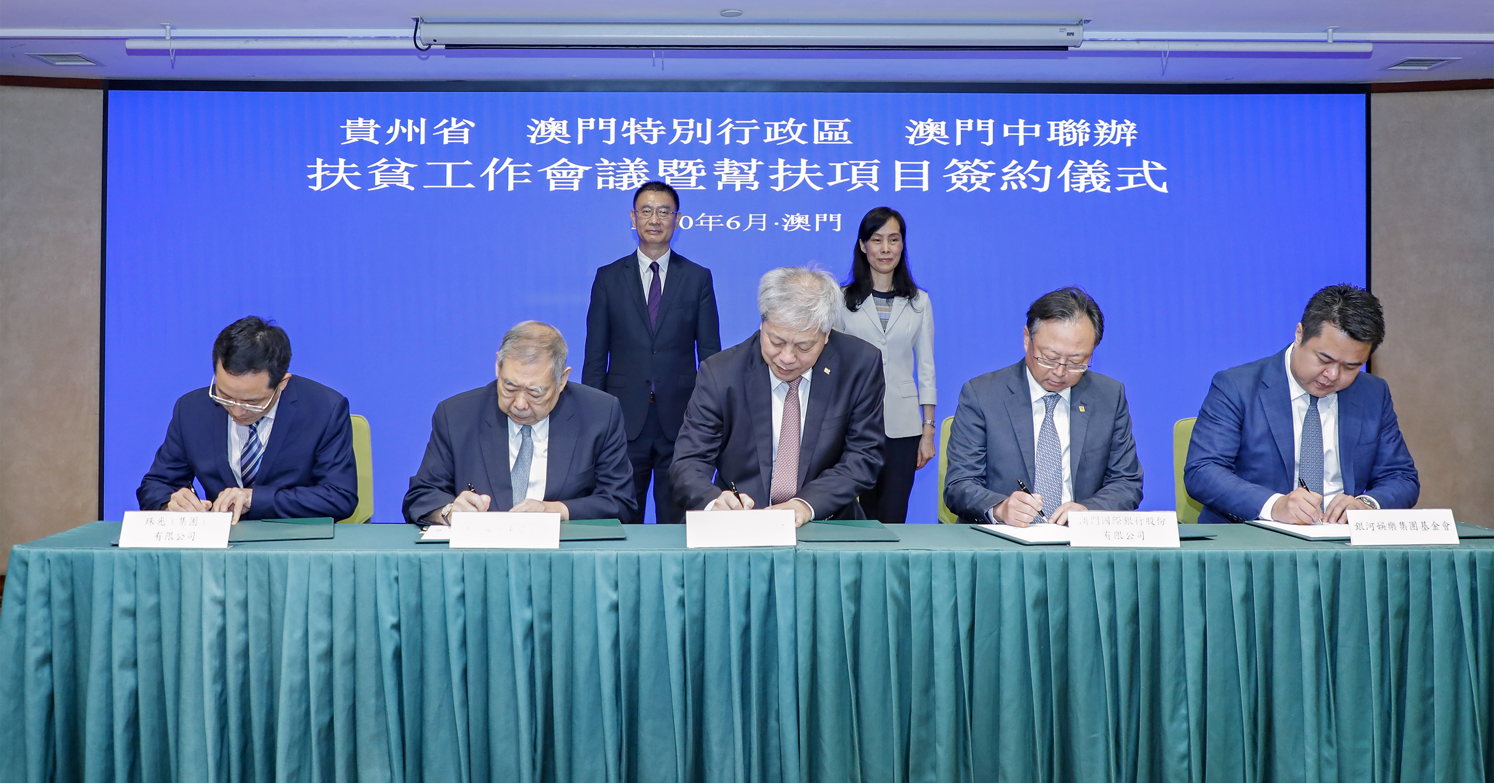 No dia 23 de Junho, o Governo da Região Administrativa Especial de Macau (RAEM), o Gabinete de Ligação do Governo Popular Central na RAEM e o governo da província de Guizhou realizaram uma reunião sobre o trabalho de cooperação no combate à pobreza e uma cerimónia de assinatura de acordos de apoio a projectos específicos. A reunião foi realizada simultaneamente por videoconferência, entre Pequim, Guiyang e Macau. O subchefe do Gabinete do Grupo Dirigente do Conselho de Estado para o Alívio da Pobreza e Desenvolvimento, Hong Tianyun, a secretária para os Assuntos Sociais e Cultura do Governo da RAEM, Ao Ieong U, o subdirector do Gabinete de Ligação do Governo Central na RAEM, Yao Jin, o vice-governador da província de Guizhou, Wu Qiang, participaram no encontro e testemunharam à assinatura de acordos sobre o apoio de Macau ao distrito de Congjiang para projectos específicos no combate à pobreza em 2020.