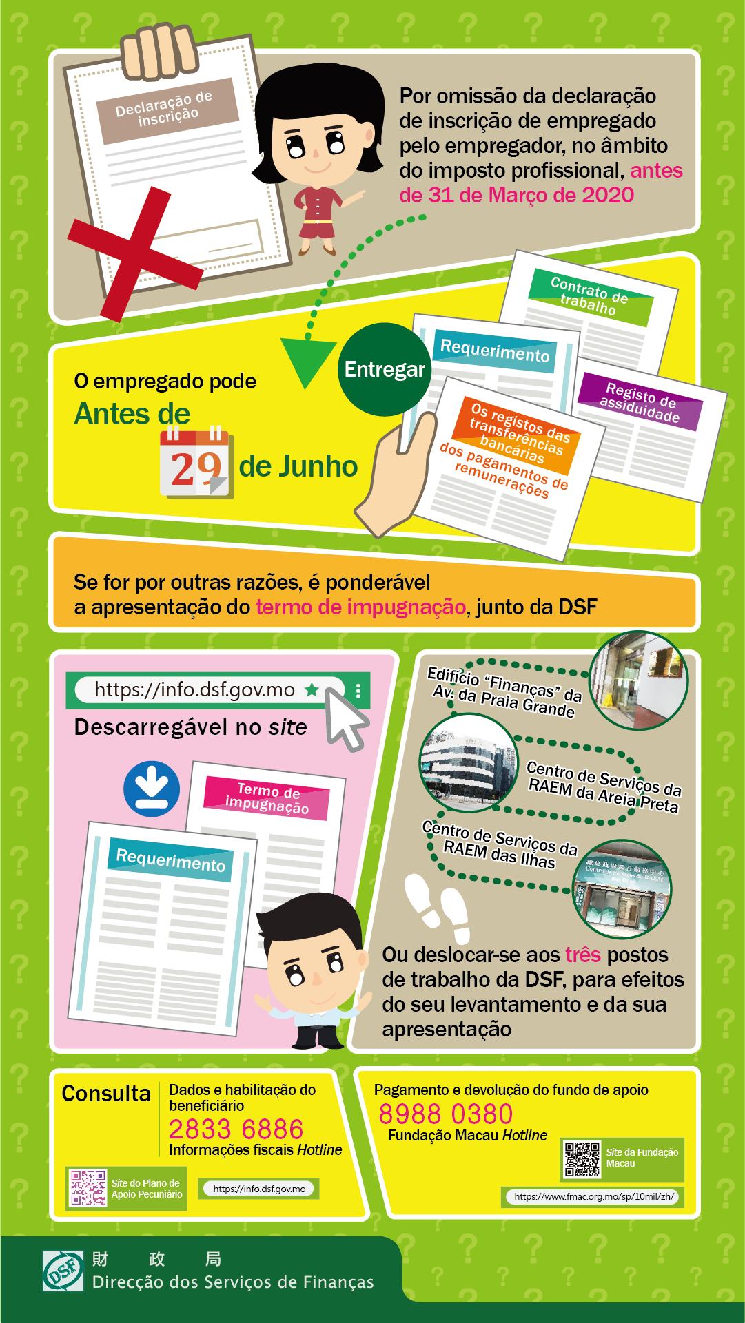 Em relação à consulta sobre as informações e a qualificação dos beneficiários, por favor telefonar para a linha aberta das informações fiscais da DSF, através de 2833 6886; e sobre o pagamento e a restituição do apoio pecuniário, por favor contactar a Fundação Macau, através do número telefónico de 8988 0380, podendo, ainda, os cidadãos aceder à seguinte página electrónica exclusiva: https://info.dsf.gov.mo.