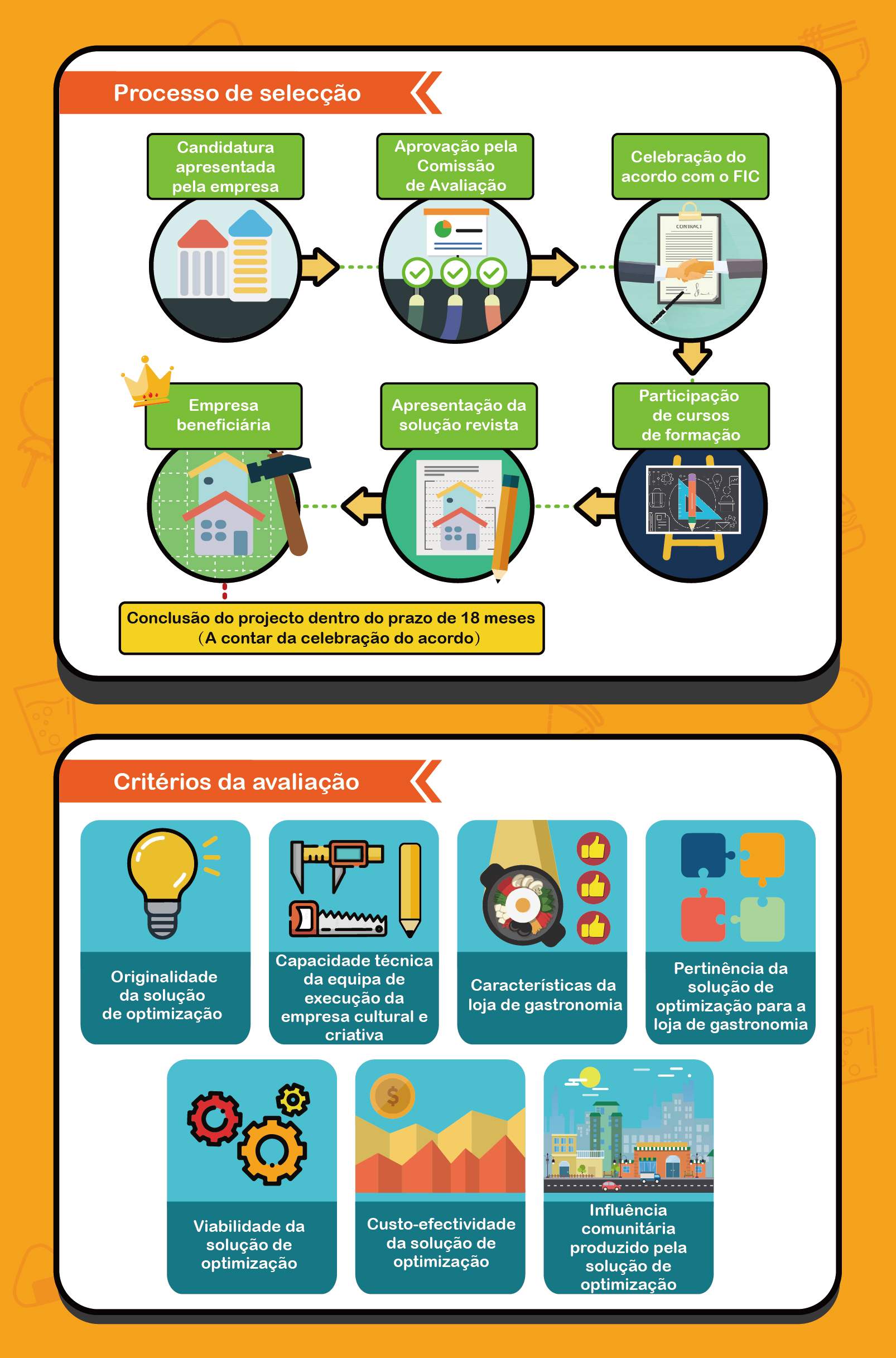 A avaliação será efectuada de acordo com os 7 indicadores como os critérios, designadamente, originalidade do projecto candidato, capacidade técnica da equipa de execução da empresa cultural e criativa, características da loja de gastronomia, bem como, viabilidade da solução de optimização, a sua pertinência com a loja de gastronomia, custo-efectividade e influência comunitária da solução de optimização.