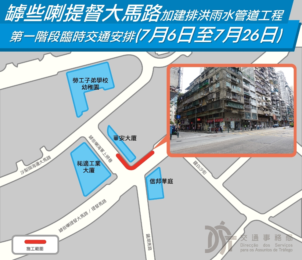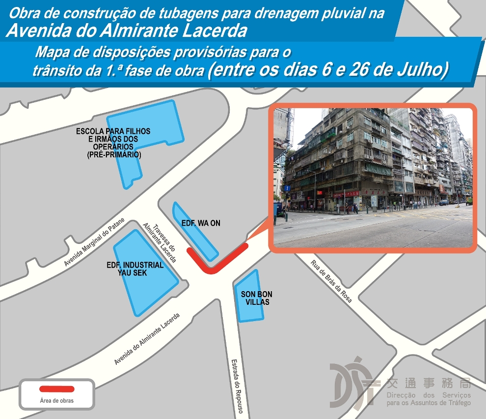 Com o intuito de aliviar as inundações no Bairro San Kio durante a época de chuvas torrenciais, o Instituto para os Assuntos Municipais (IAM) vai iniciar a obra intitulada “Construção de tubagens para drenagem pluvial na Avenida do Almirante Lacerda”, tendo por objectivo ligar os esgotos de drenagem das águas existentes na Travessa do Almirante Lacerda, o que contribuirá para reforçar a capacidade de escoamento de águas da rede de tubagens para drenagem pluvial. A presente obra será realizada de forma faseada. Durante a execução da obra, serão implementadas medidas de trânsito provisórias.