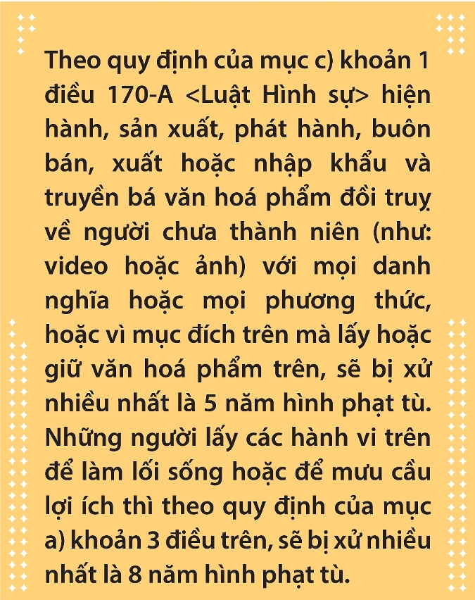 Theo quy định của mục c) khoản 1 điều 170-A hiện hành, sản xuất, phát hành, buôn bán, xuất hoặc nhập khẩu và truyền bá vănhoá phẩm đồi truỵ về người chưa thành niên (như: video hoặc ảnh) với mọi danh nghĩa hoặc mọi phương thức, hoặc vì mục đích trên mà lấy hoặc giữ vănhoá phẩm trên, sẽ bị xử nhiều nhất là 5 năm hình phạt tù. Những người lấy cáchành vi trên để làm lối sống hoặc để mưu cầu lợi ích thì theo quy định của mục a) khoản 3 điều trên, sẽ bị xử nhiều nhất là 8 năm hình phạt tù.