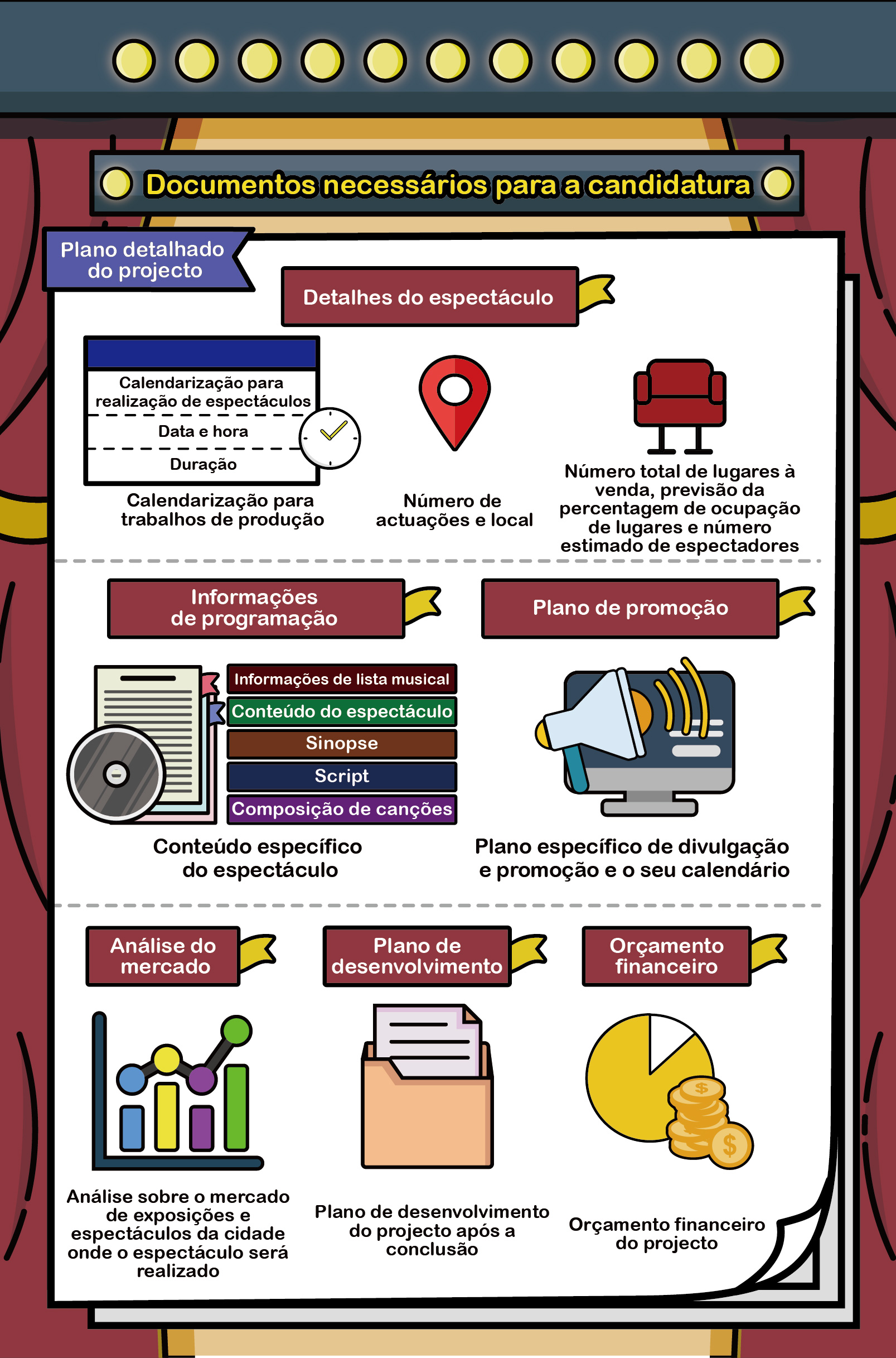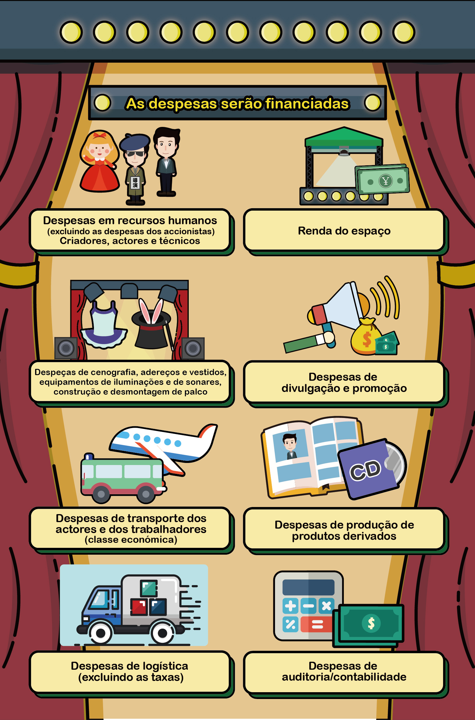 O FIC irá admitir os projectos candidatos por forma de selecção, no total de 10 projectos concedidos, com o período de execução do projecto de 18 meses. O limite de apoio financeiro é de 90% do custo total do projecto, sendo o limite máximo de MOP800 mil. Os âmbitos para a utilização das verbas de apoio financeiro incluem: despesas em recursos humanos (criadores, actores e técnicos); renda do espaço para a realização de exposições e espectáculos; despesas de cenografia, adereços e vestidos, equipamentos de iluminações e de sonares, construção e desmontagem de palco; despesas de divulgação e promoção; despesas de transporte dos actores e dos trabalhadores (especificação designada); despesas de produção de produtos derivados; despesas de logística e de auditoria/contabilidade. O FIC irá prestar apoio financeiro na forma de pagamento de despesas efectivas, devendo as verbas de apoio financeiro ser geridas através de conta bancária específica fechada, sujeitando-se à auditoria de companhia auditora, no sentido de assegurar que o erário público seja eficientemente aplicado. As empresas interessadas podem descarregar o Boletim de Candidatura na página electrónica (www.fic.gov.mo). Para quaisquer dúvidas, queira consultar através do n.º de telefone 2850 1000 ou por e-mail (info@fic.gov.mo).