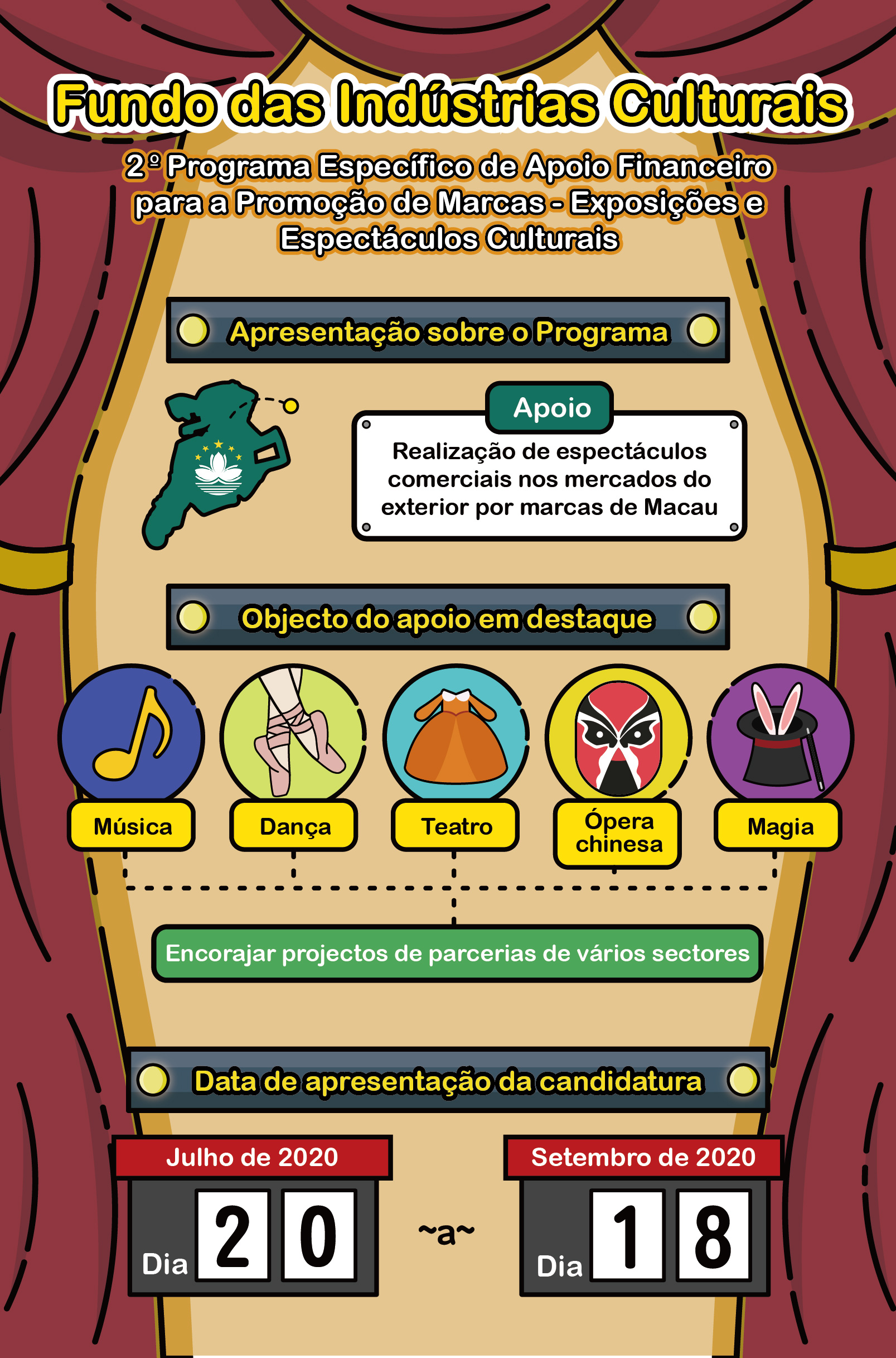 O “Programa Específico de Apoio Financeiro para a Promoção de Marcas - Exposições e Espectáculos Culturais” visa impulsionar a realização de espectáculos comerciais no exterior, ou seja, espectáculos em palco, incluindo música, dança, teatro, ópera chinesa ou magia, com o objectivo de aumentar a visibilidade e popularidade das marcas dos projectos de exposições e espectáculos de Macau nos mercados do exterior, promovendo a industrialização do sector.