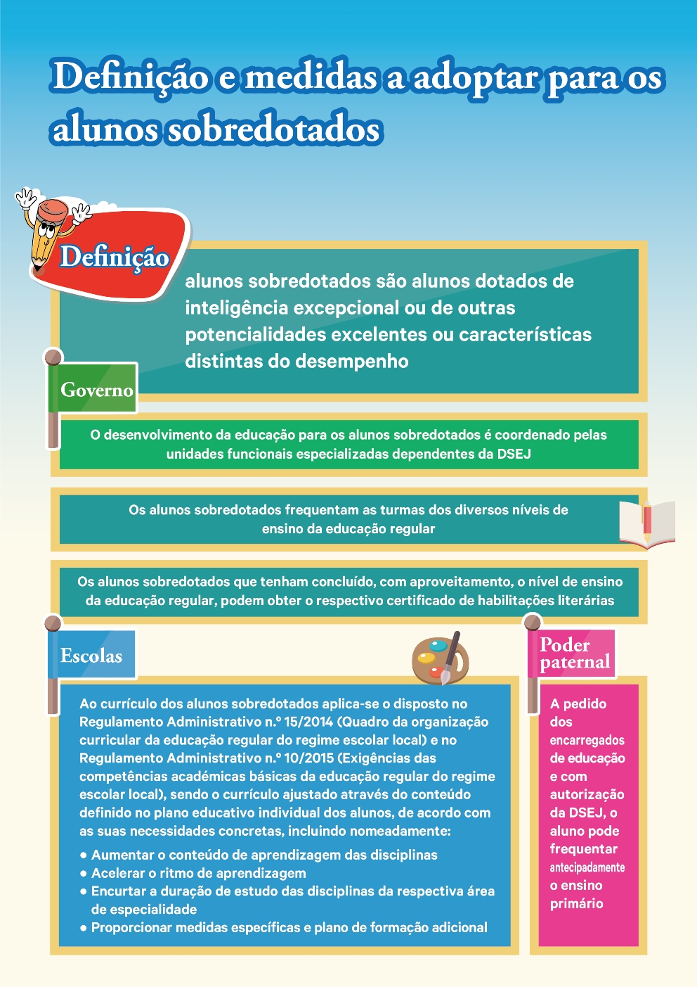 O Decreto-Lei n.º 33/96/M, que regulariza o “Regime educativo especial”, tem vindo a ser implementado há mais de vinte anos, encontrando-se algumas das suas disposições já desarticuladas com as solicitações e o desenvolvimento do ensino especial de Macau. Para prestar um apoio eficaz aos alunos com necessidades educativas especiais e promover o desenvolvimento do ensino especial, o Governo da RAEM definiu o regulamento administrativo do “Regime do ensino especial”, regularizando e tornando ainda mais concretas as medidas de apoio aos alunos com necessidades educativas especiais (alunos com limitações físicas e psicológicas e alunos sobredotados).