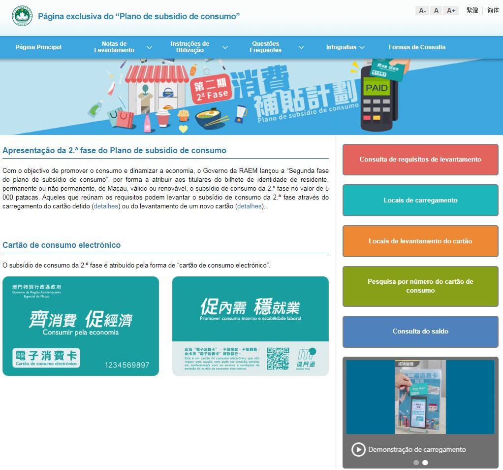 1. Para assegurar a ordem na realização do carregamento do cartão de consumo, os residentes podem consultar, antes de carregamento na próxima semana, as informações sobre o saldo no cartão e os locais de carregamento, através da página exclusiva do Plano de subsídio de consumo da DSE (https: / / www.economia.gov.mo / consumo / zh _ TW / index.jsp).