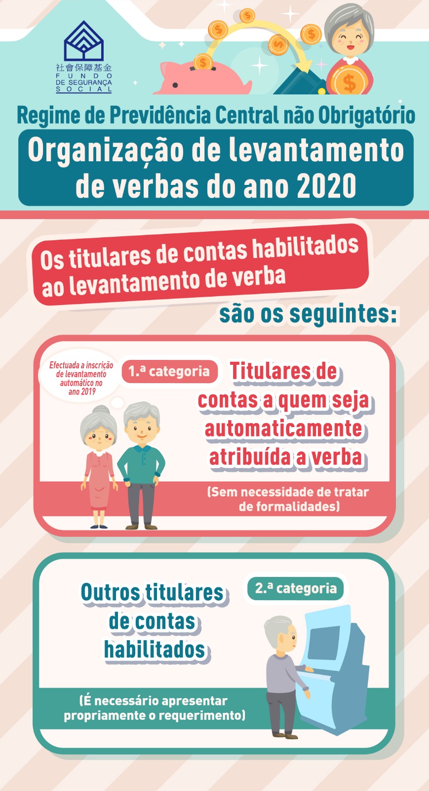 Para facilitar os idosos no levantamento da verba atribuída pelo Governo, o Fundo de Segurança Social (FSS) lançou no ano passado a medida de "inscrição de levantamento automático de verbas a título de repartição extraordinária de saldos orçamentais do regime de previdência central não obrigatório", registou-se um total de 54.000 idosos que efectuaram a inscrição e preencheram os requisitos de atribuição automática de verbas deste ano, estes vão receber a respectiva verba no dia 21 de Agosto, sem necessidade de tratar de quaisquer formalidades, e serão notificados por SMS ou por ofício no final de Julho.